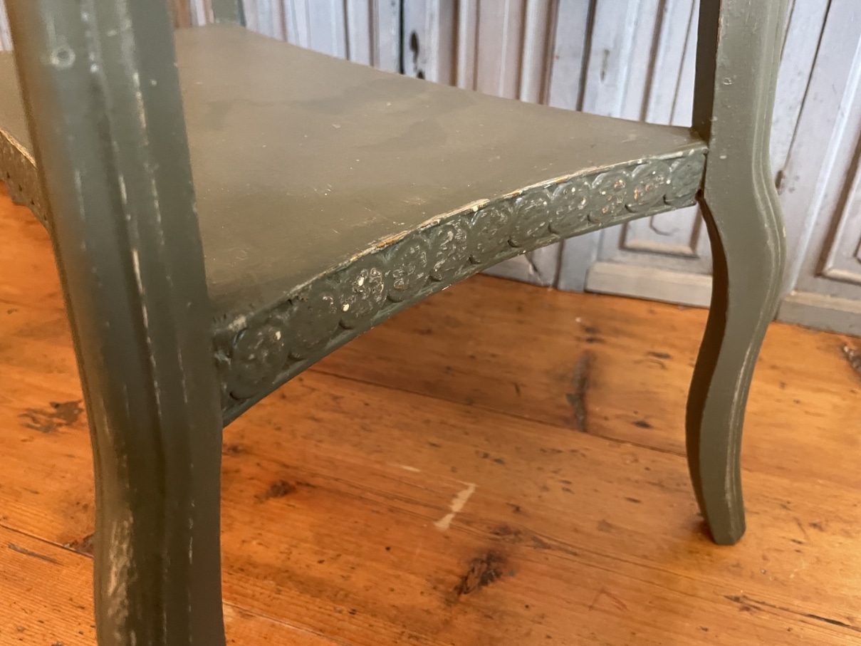 Het tafeltje heeft een dubbel plateau mooi gebogen poten en zowel de zijrand als de zijrand van het plateau onder
