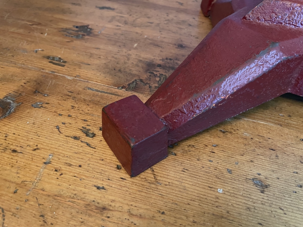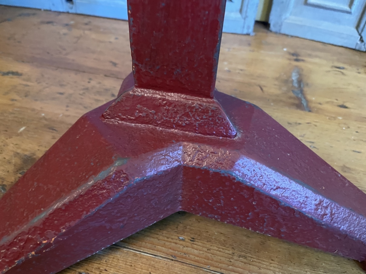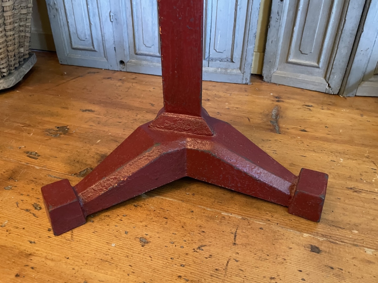 De tafel heeft een gietijzeren poot in een rode kleur en een houten blad.
