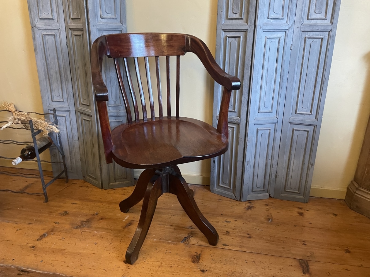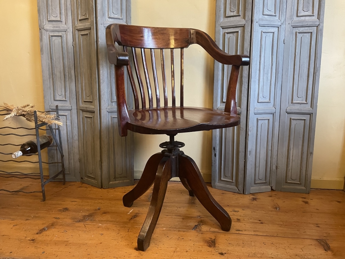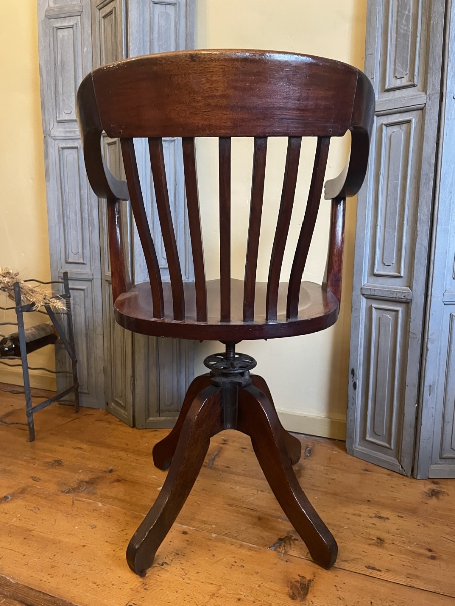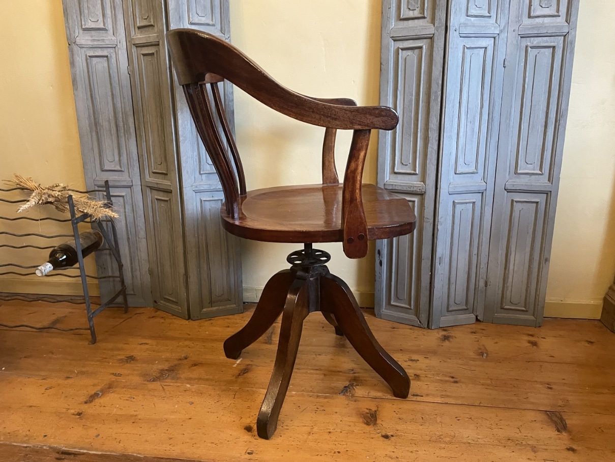 Een beetje sjieke draaistoel of bureaustoel uit de art deco periode van Frankrijk uitgevoerd in Mahoniehout.met een ijzeren draaisysteem.