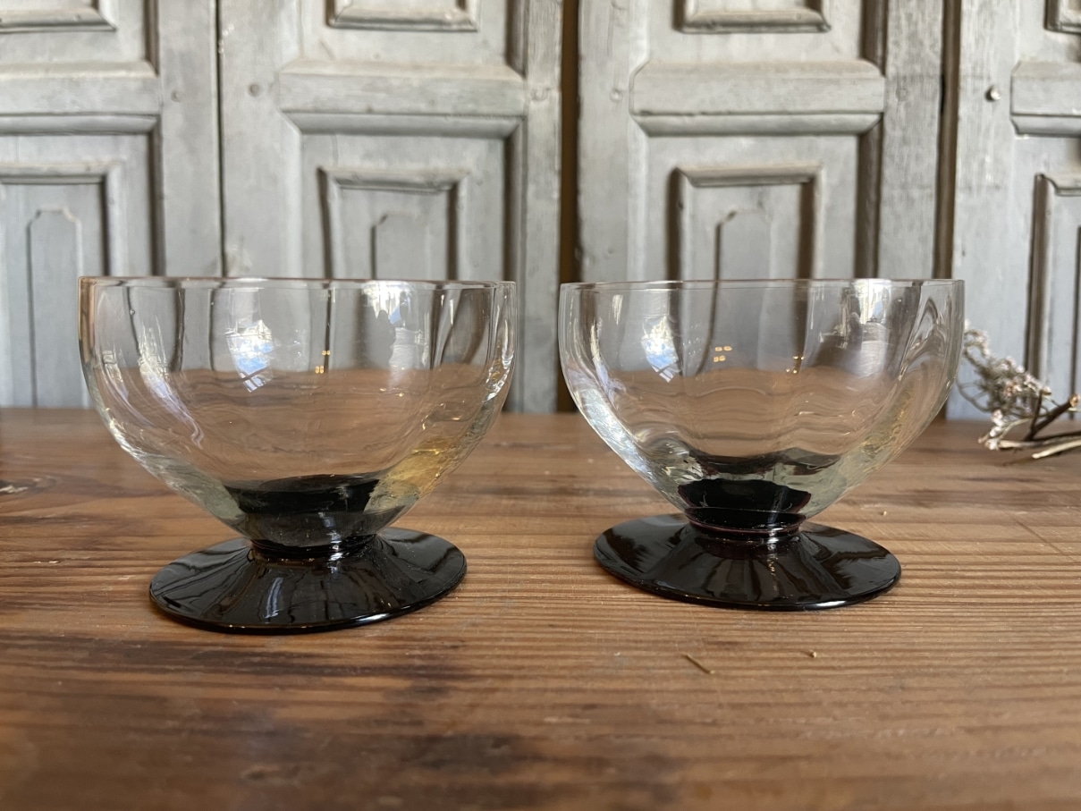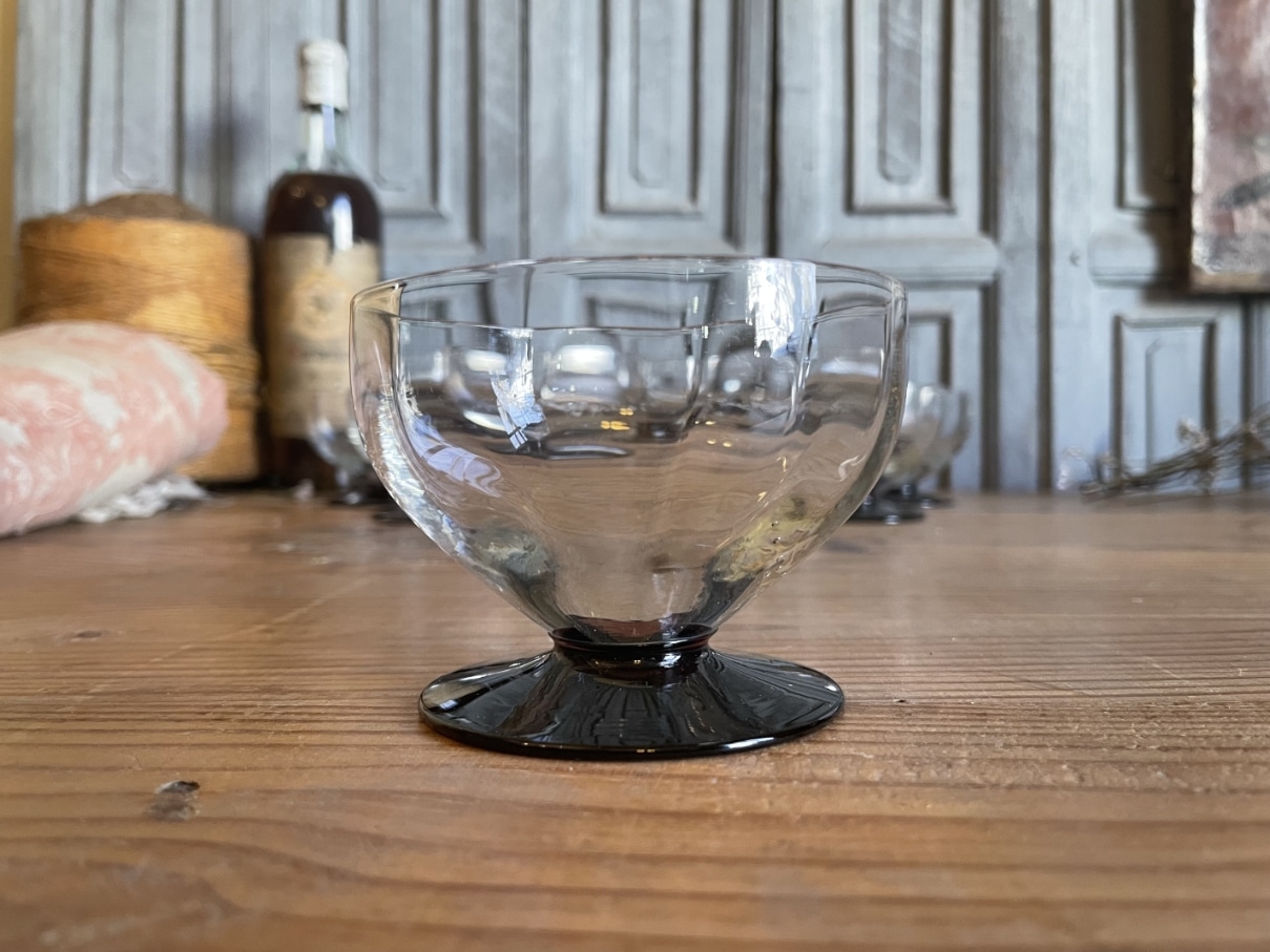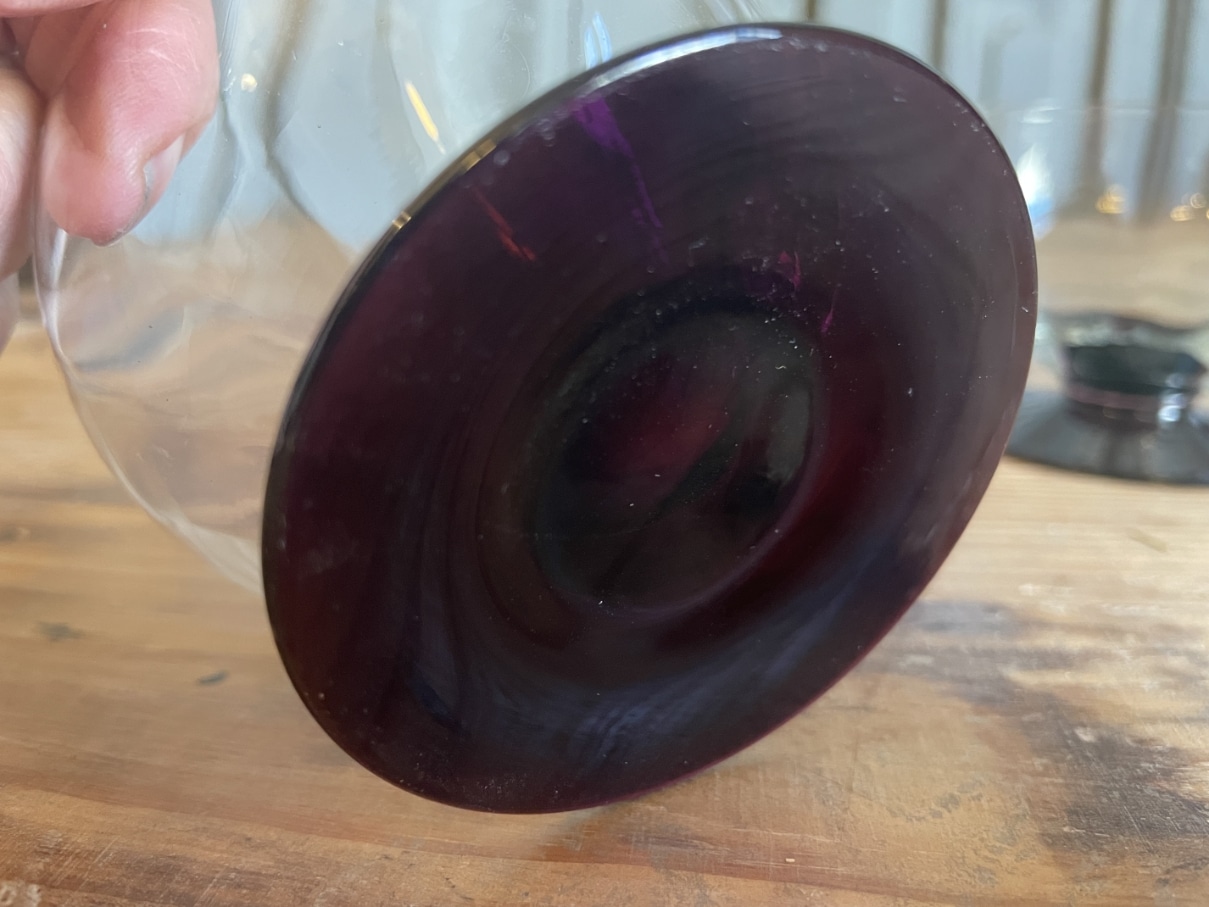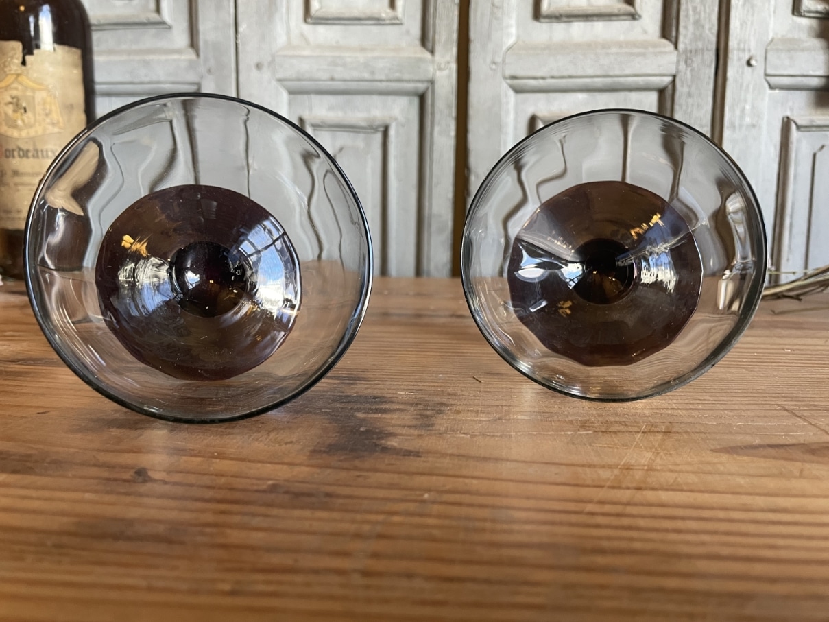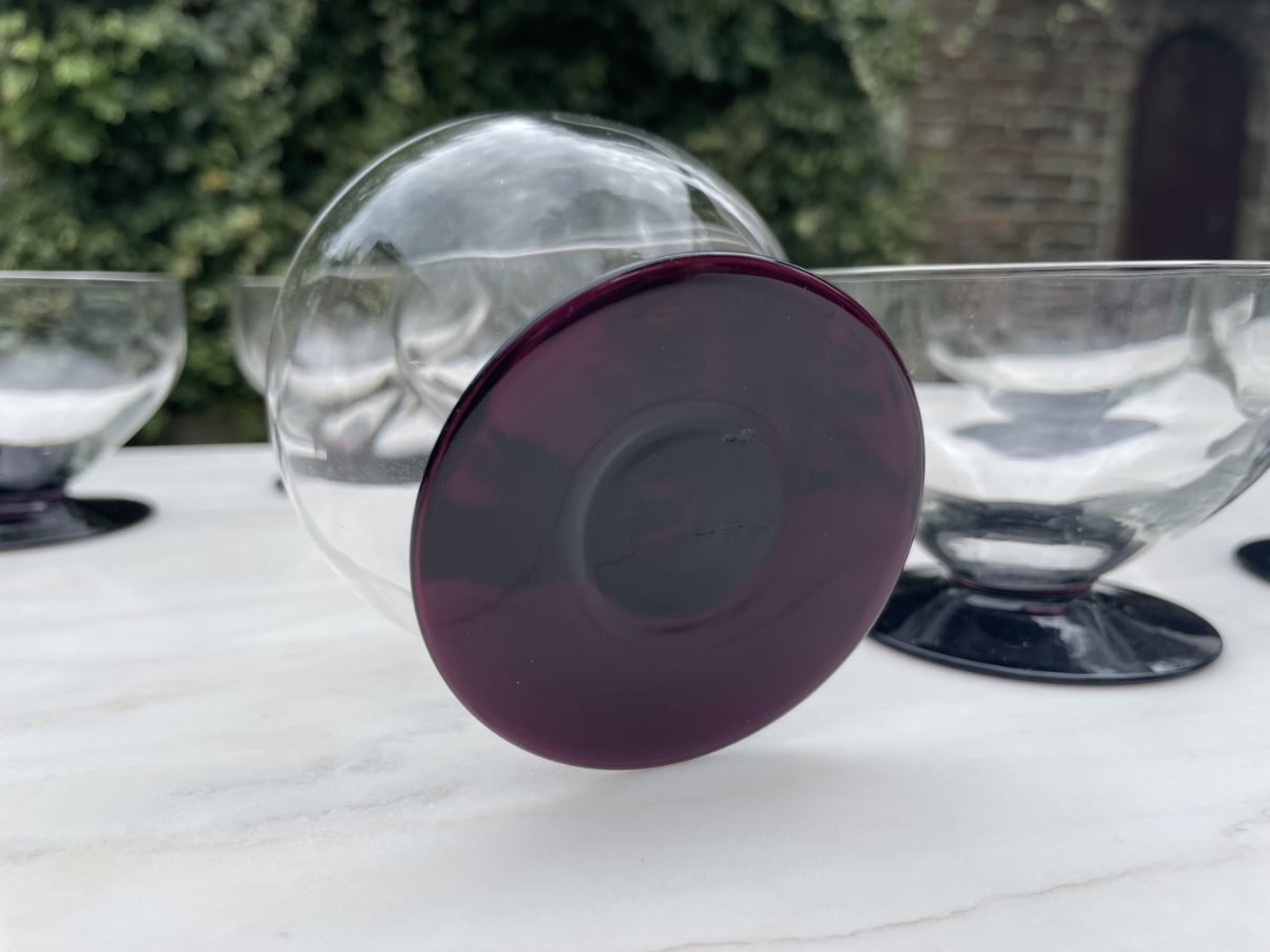 De heldere glazen zijn 8 kantig van vorm en hebben een donker aubergine paarse voet.