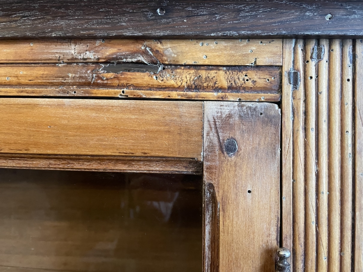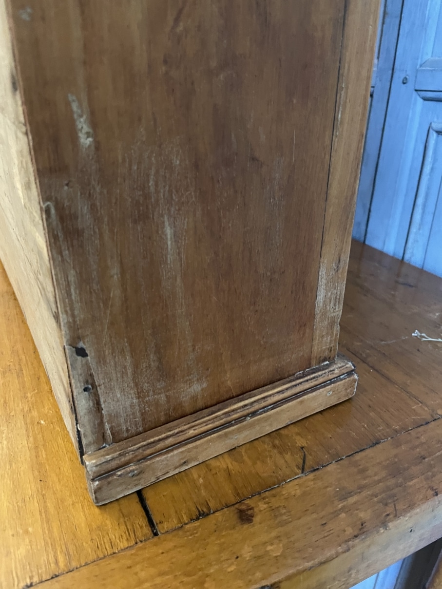 Het kastje heeft op de deur het typisch Frans schuifje zitten zo ook de mooie scharnieren.
