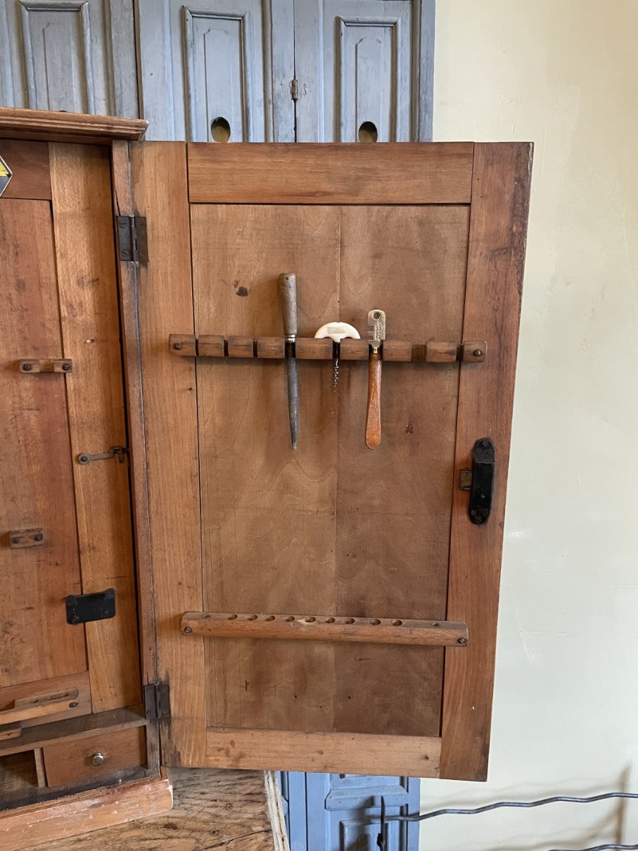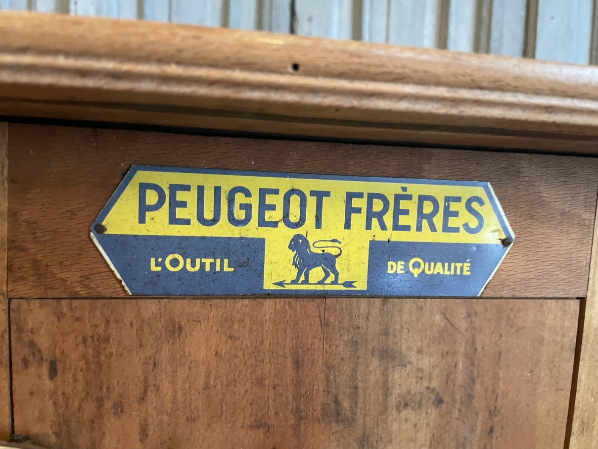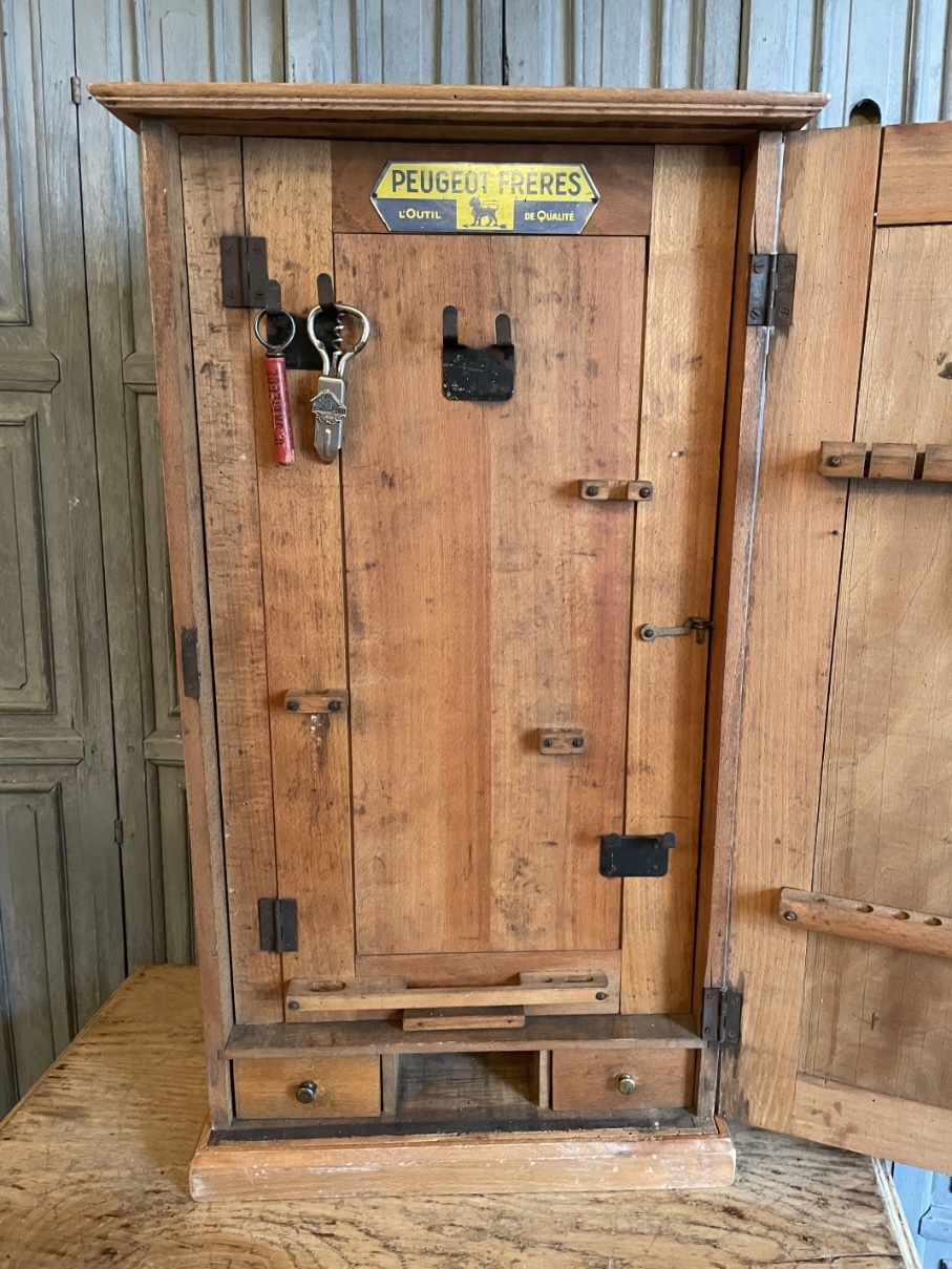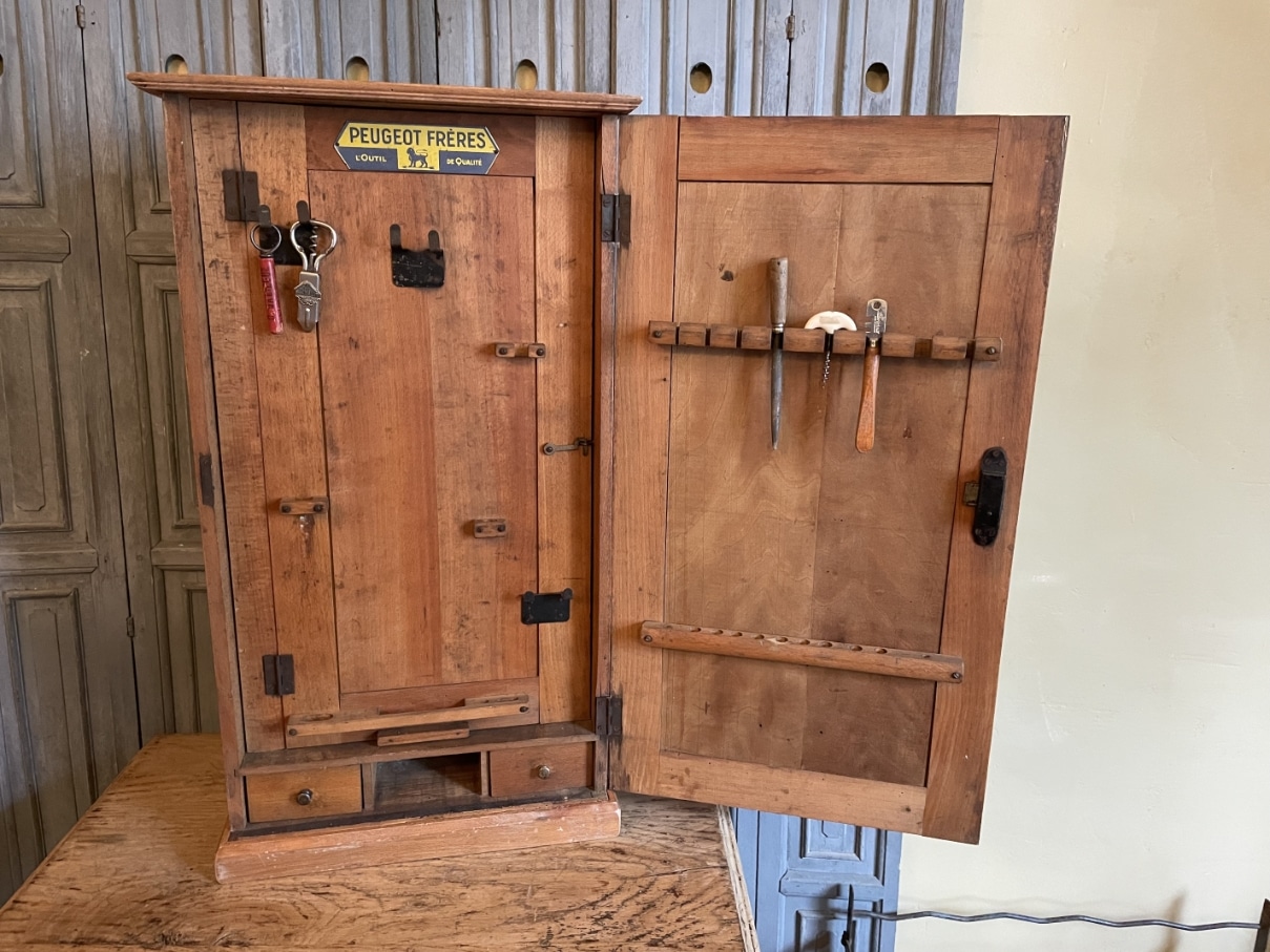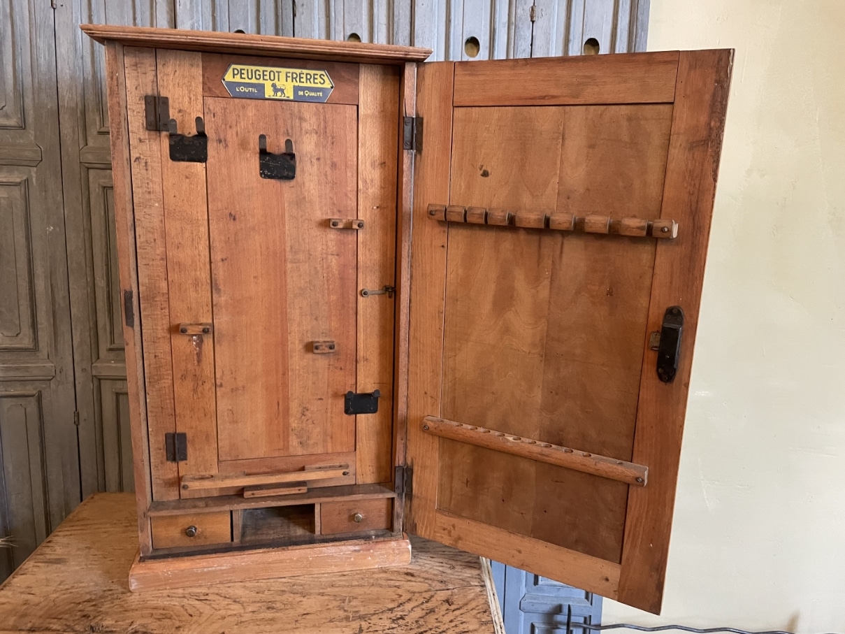 Een uniek object is dit gereedschapskastje wat uit de garage van De Peugeot Fréres komt. Waar het kastje ook vol heeft gehangen met klein gereedschap gemaakt van het mooie beukenhout.