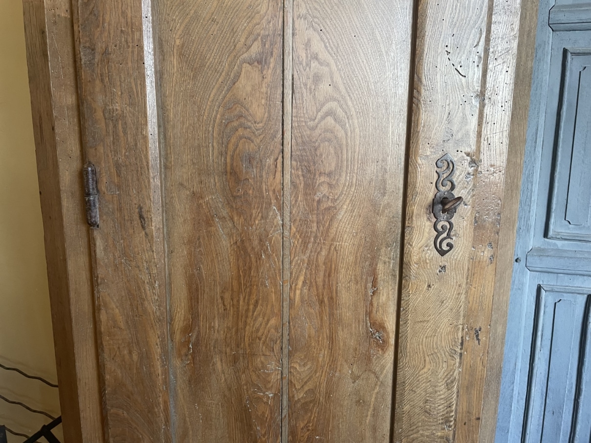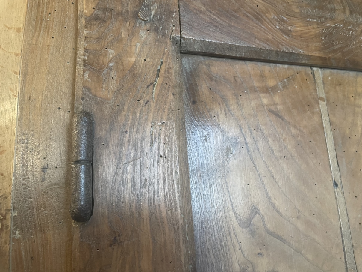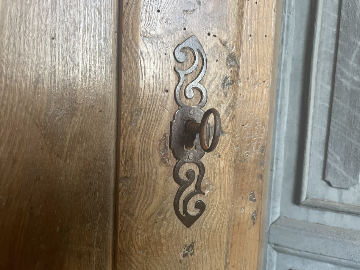Op de deur zit een frivool ijzeren beslag.