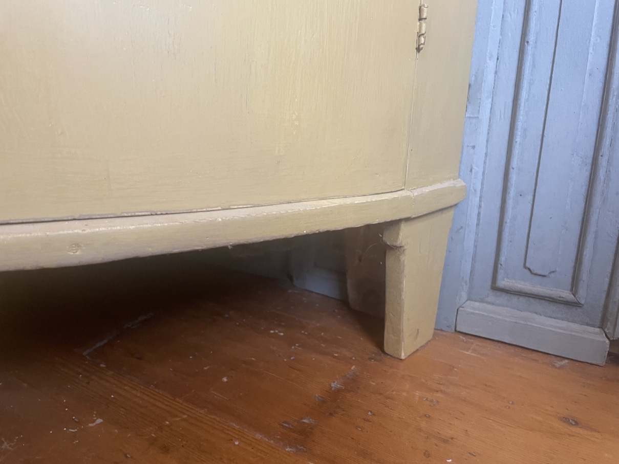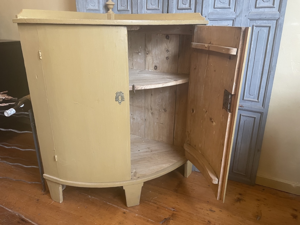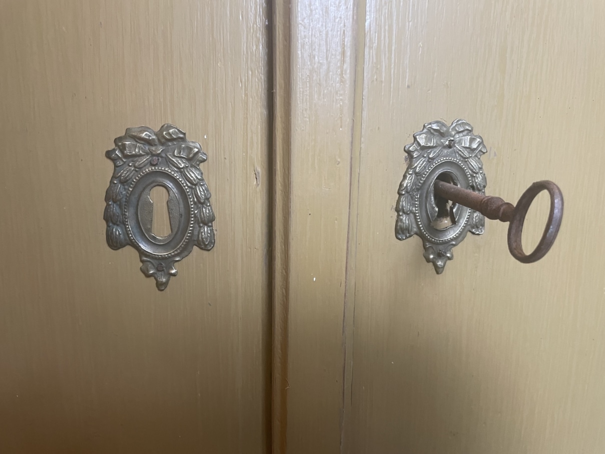De kast heeft mooi bolle deuren met daarop een messing beslag.
