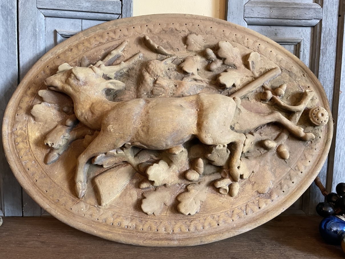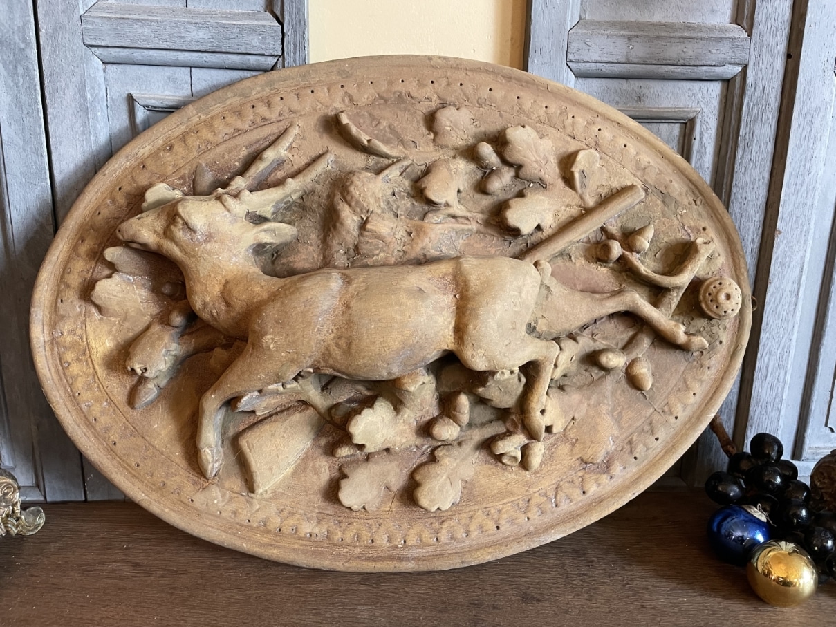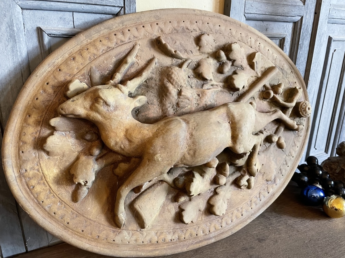 Een mooi en uniek vintage decoratief gipsen reliëf van een jachttafereel uit de jaren 60 van Frankrijk.
