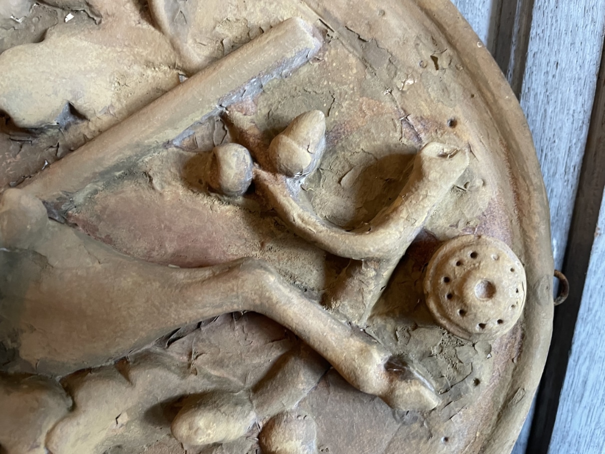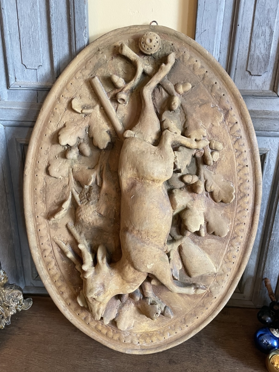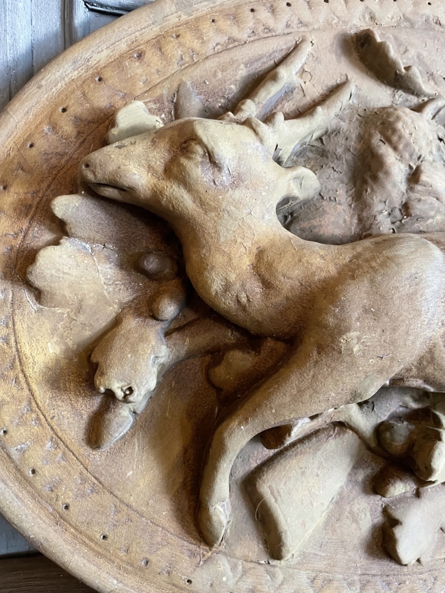 Een mooi en uniek vintage decoratief gipsen reliëf van een jachttafereel uit de jaren 60 van Frankrijk.