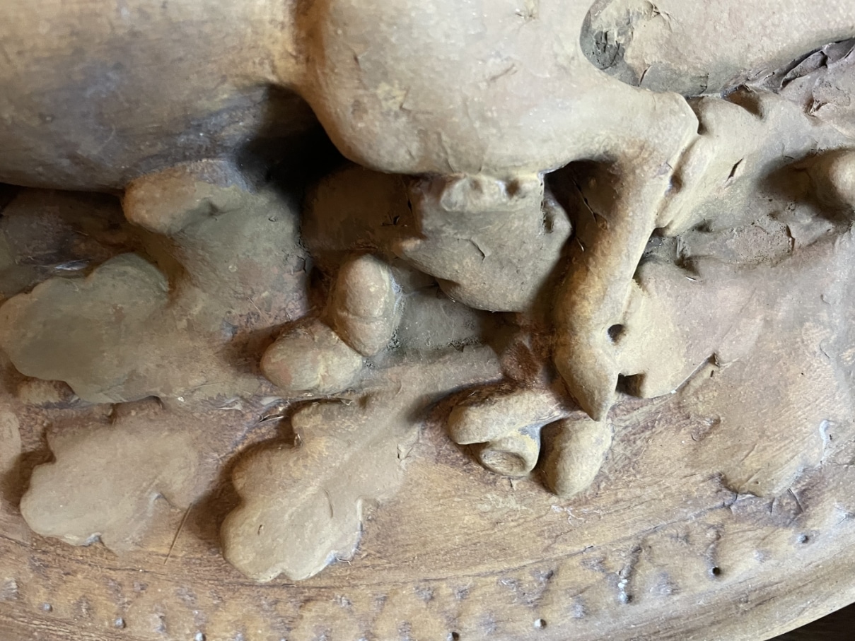 Op de medaillon zien we een geschoten hert liggend op een geweer in eikels en eikenblad.