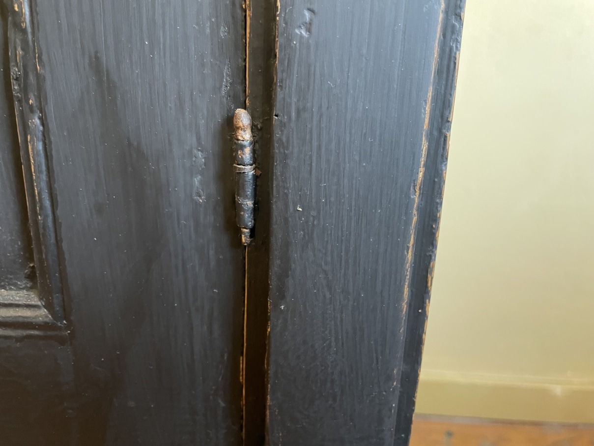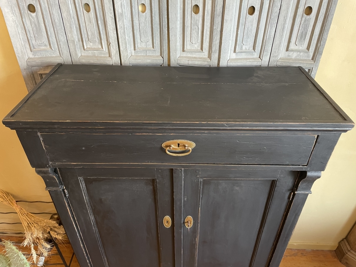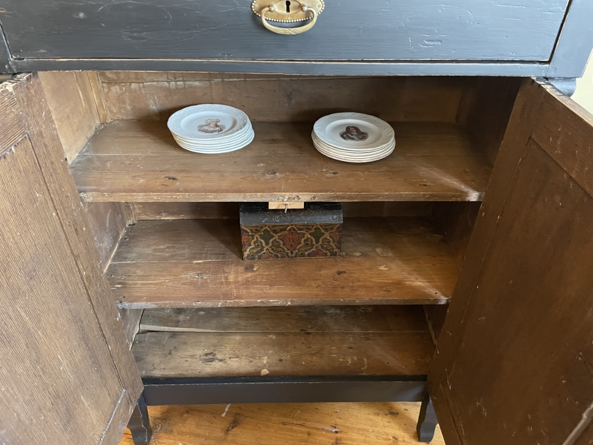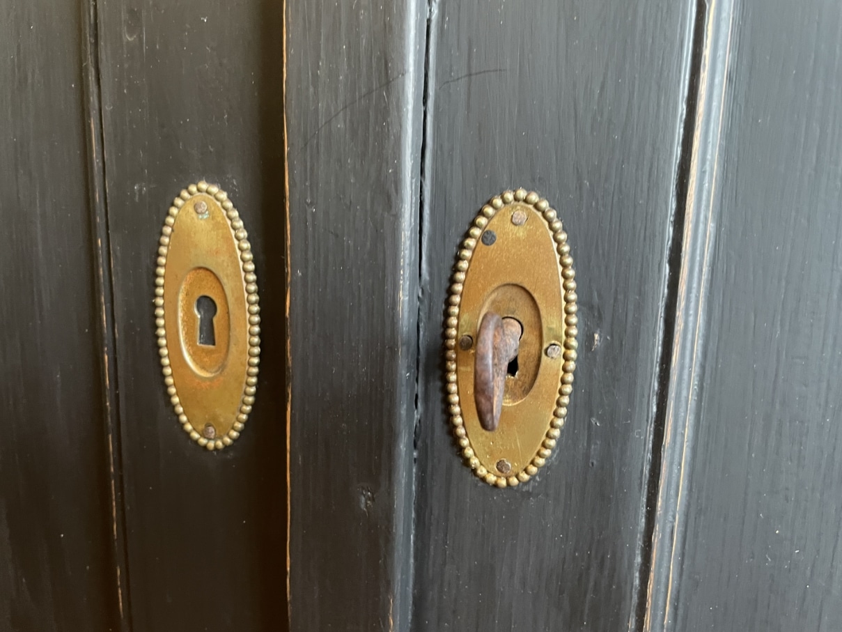 Op de kast zit messing beslag.
