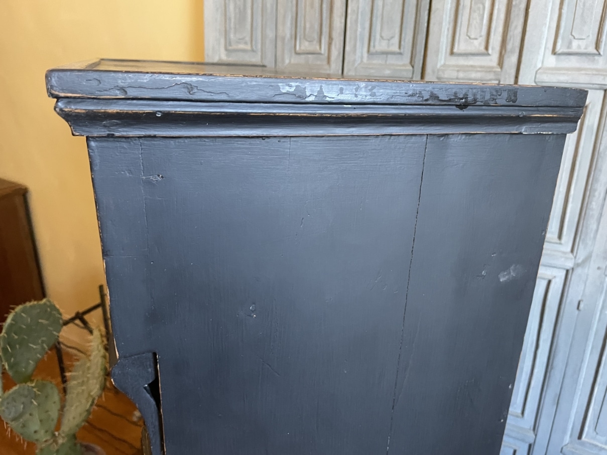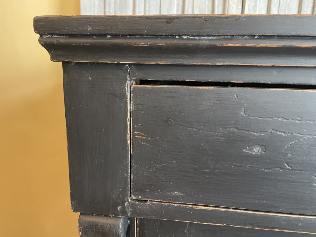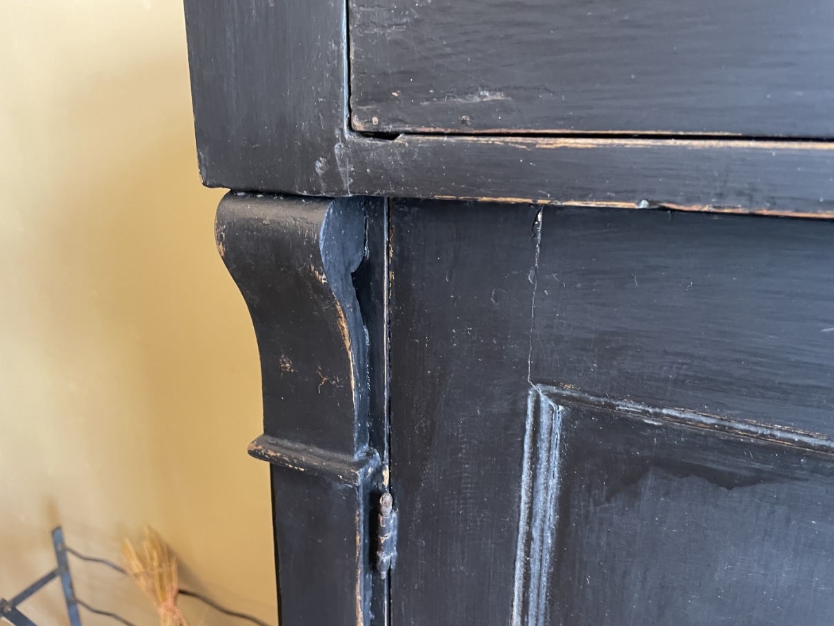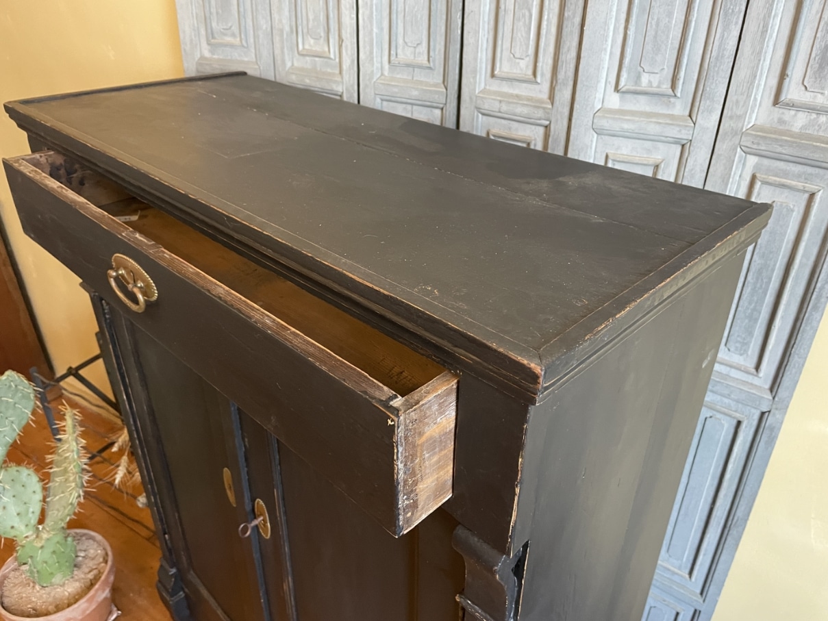 Op de kast zit messing beslag.