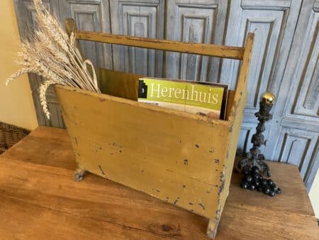Een hele sfeervolle boeren krantenbak in een mooie gele kleur.