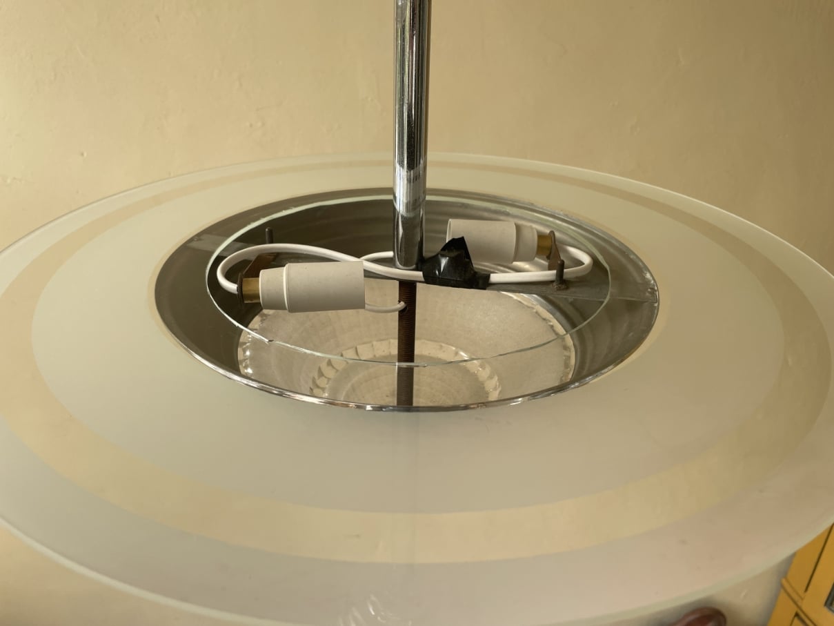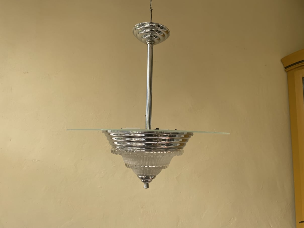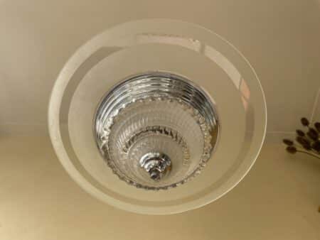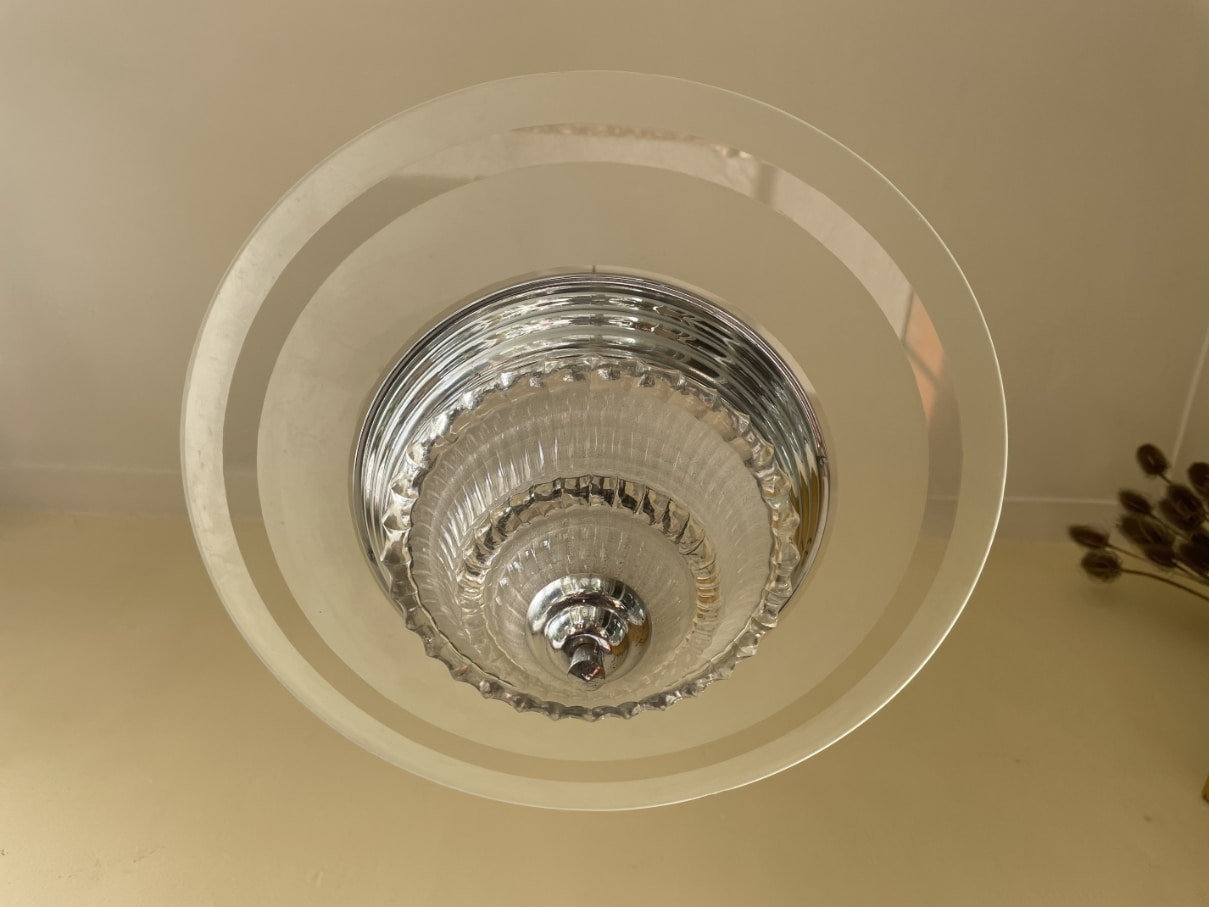De lamp heeft een verchroomde pendel met 2 lichtpunten. En onder in de getrapte verchroomde rand een uitlopend dik gestileerd glas.
