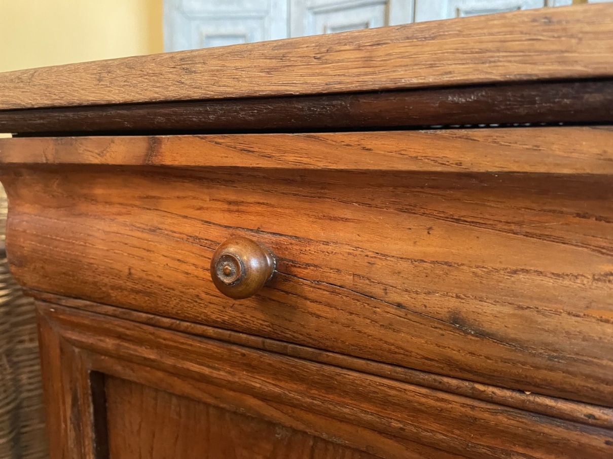 Het kastje is gemaakt van notenhout.