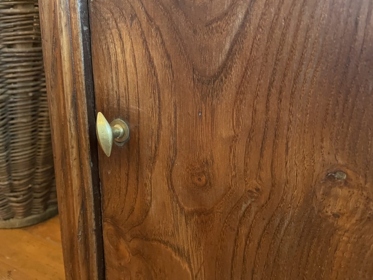 Op het leuke laadje zit een houten knop en de deur een messing greepje.