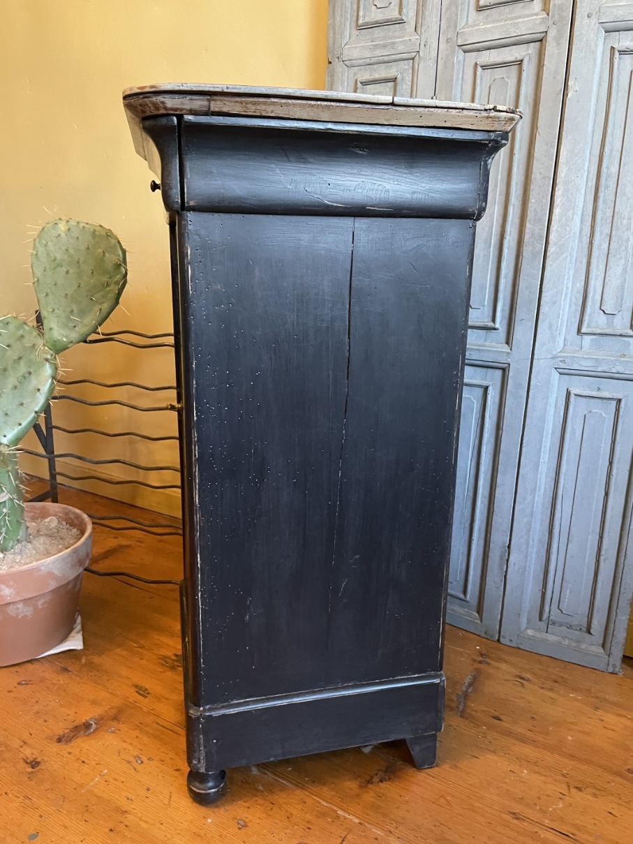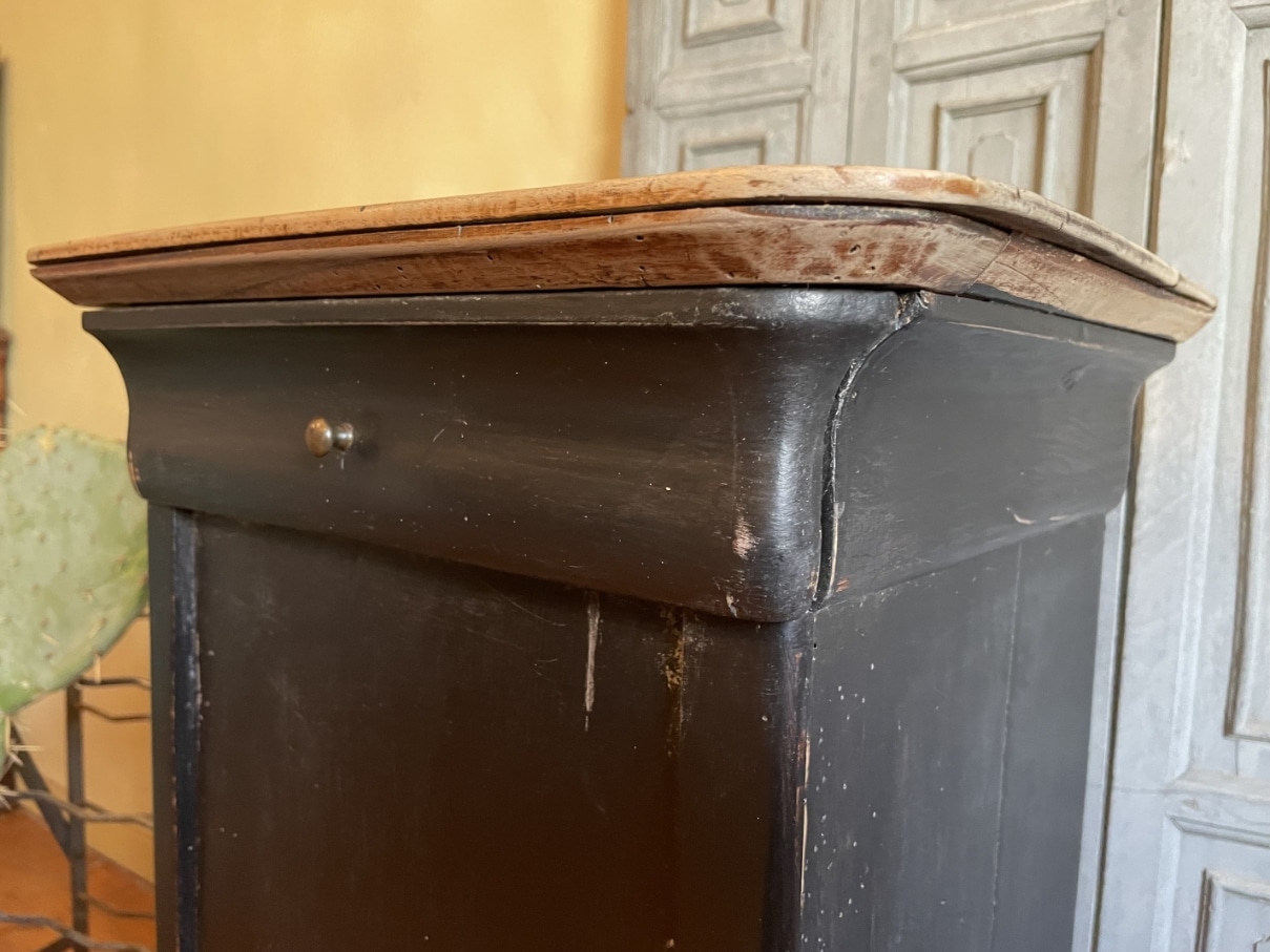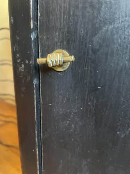 In de kap zit het laadje en op de deur een messing greepje in de vorm van een hand.