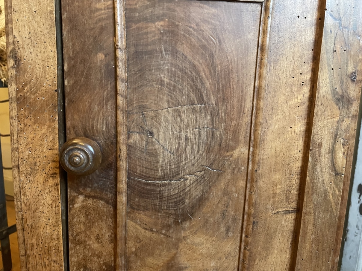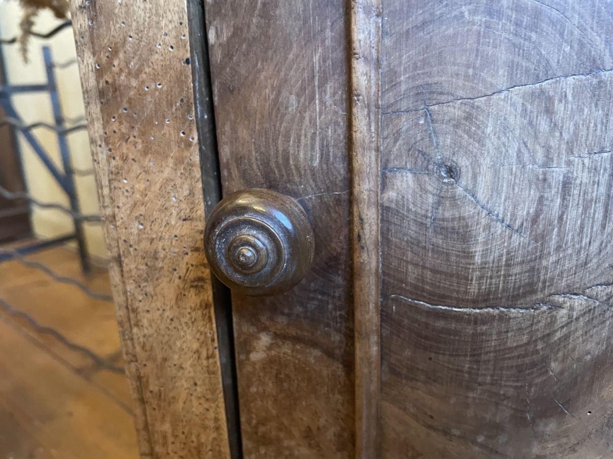 Bovenin een laadje met daarop een messing greepje en op het deurtje zit een houten knop.