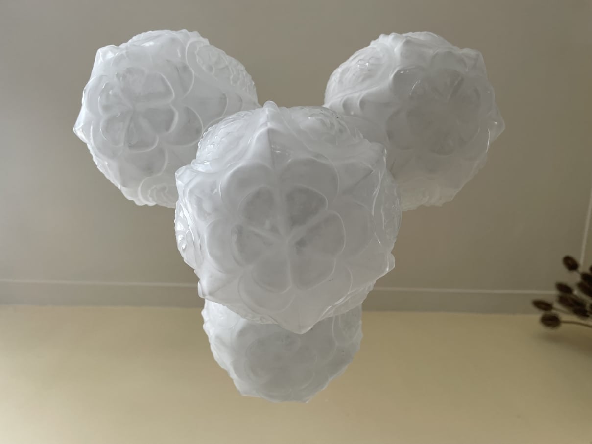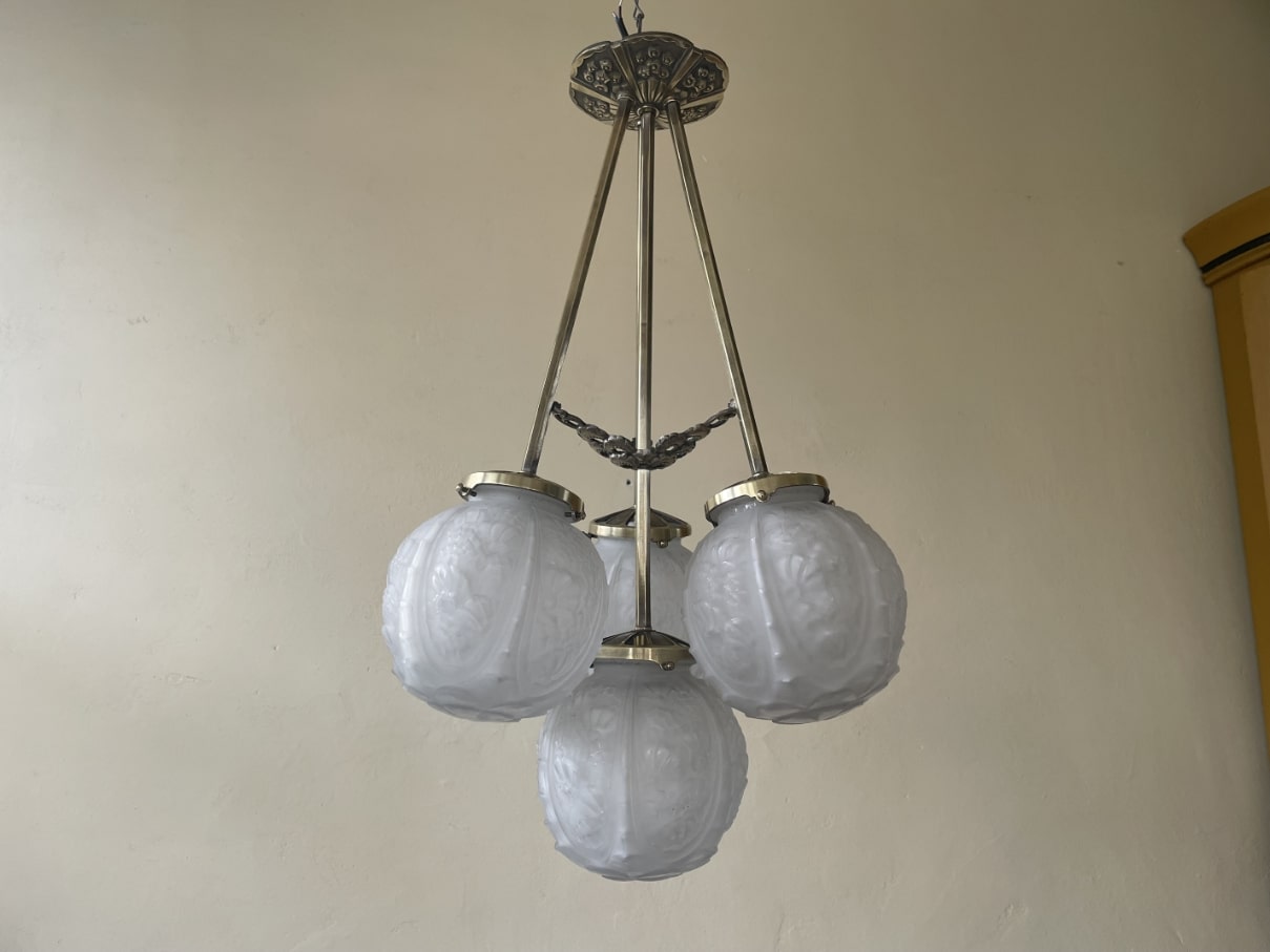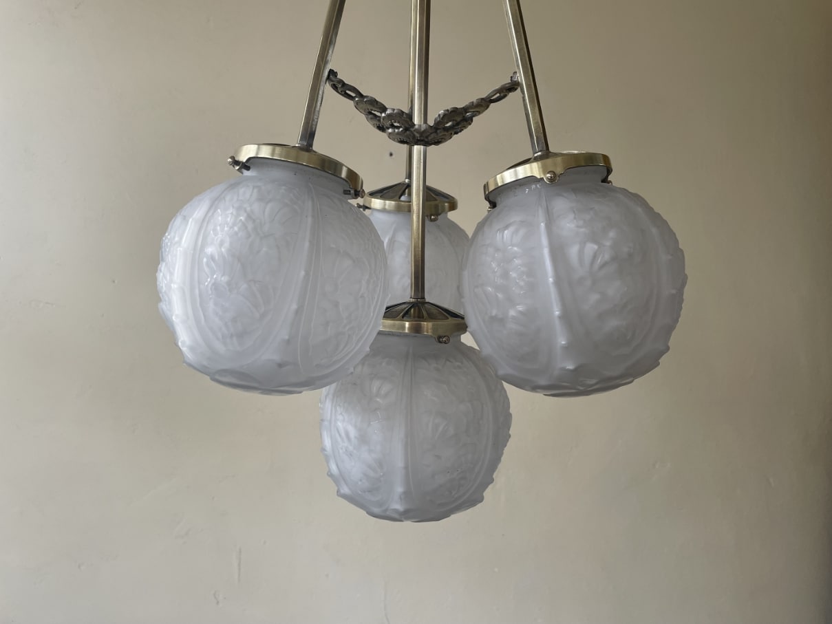 De prachtige gedecoreerde pendel bevat 4 gestileerde matglazen bollen.