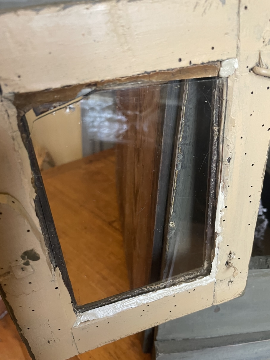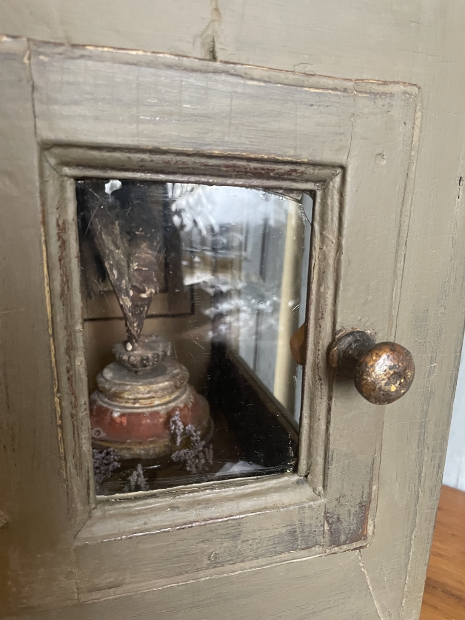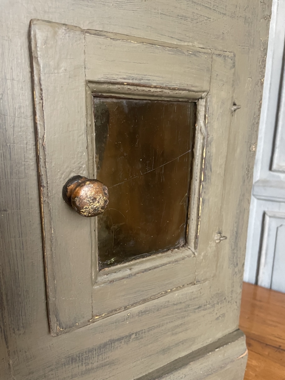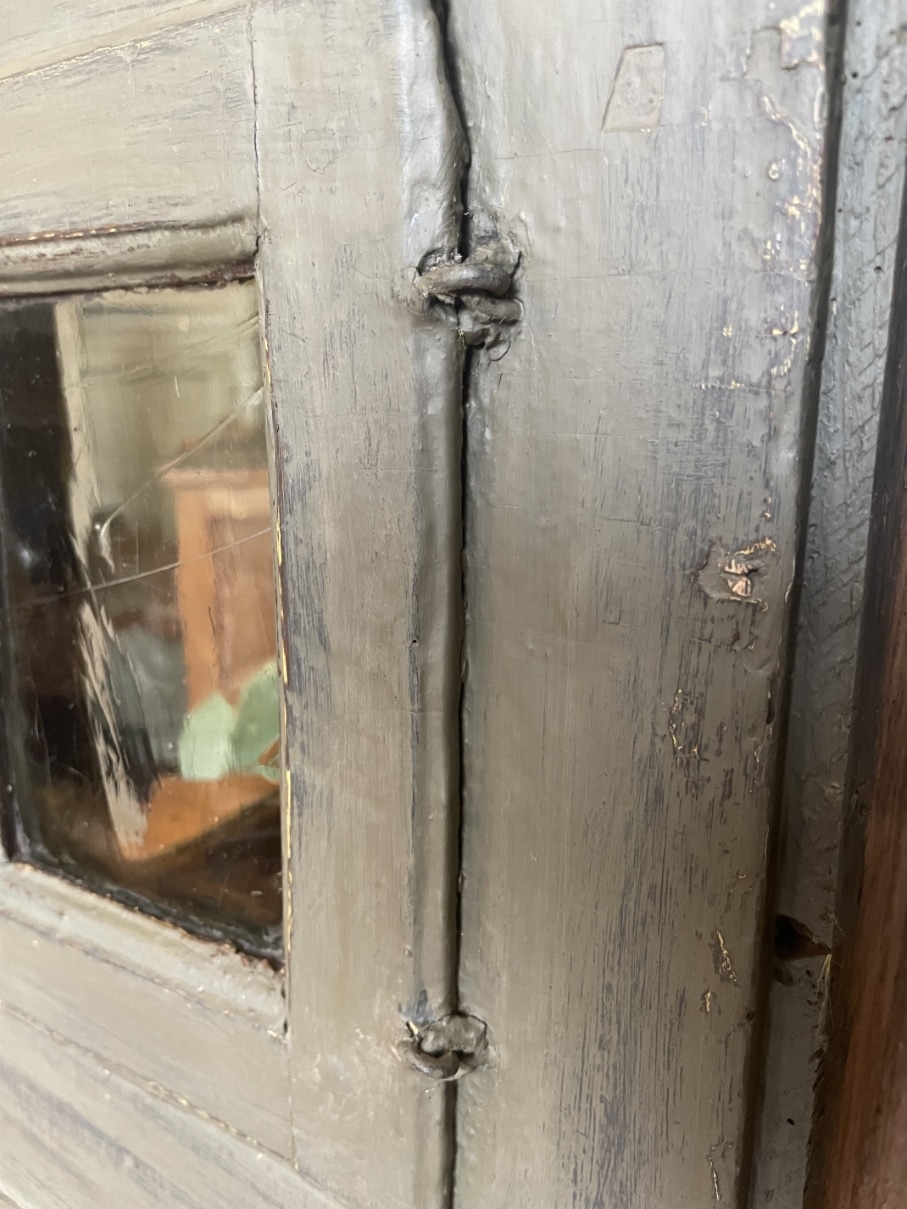 Het kastje heeft ook aan de zijkanten deuren met heel oud glas en scharnieren.