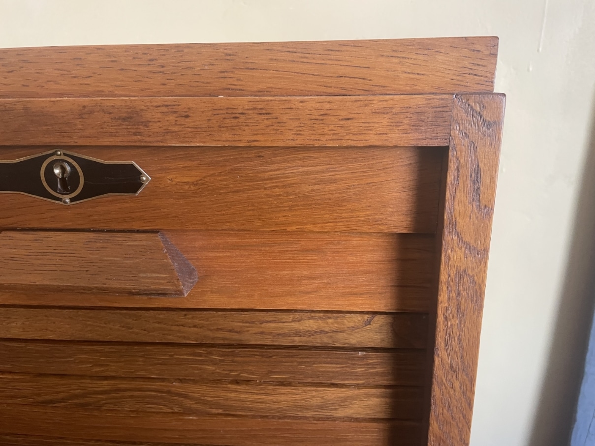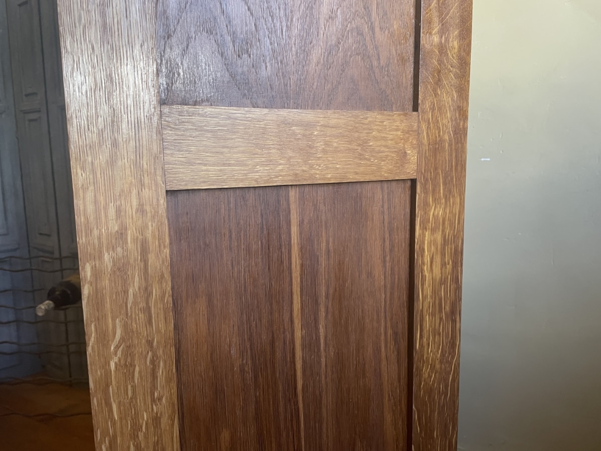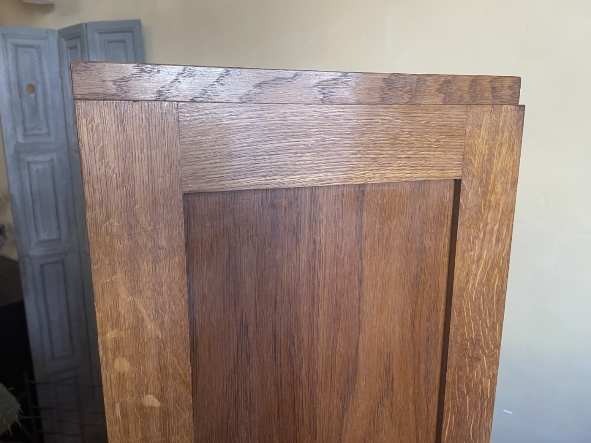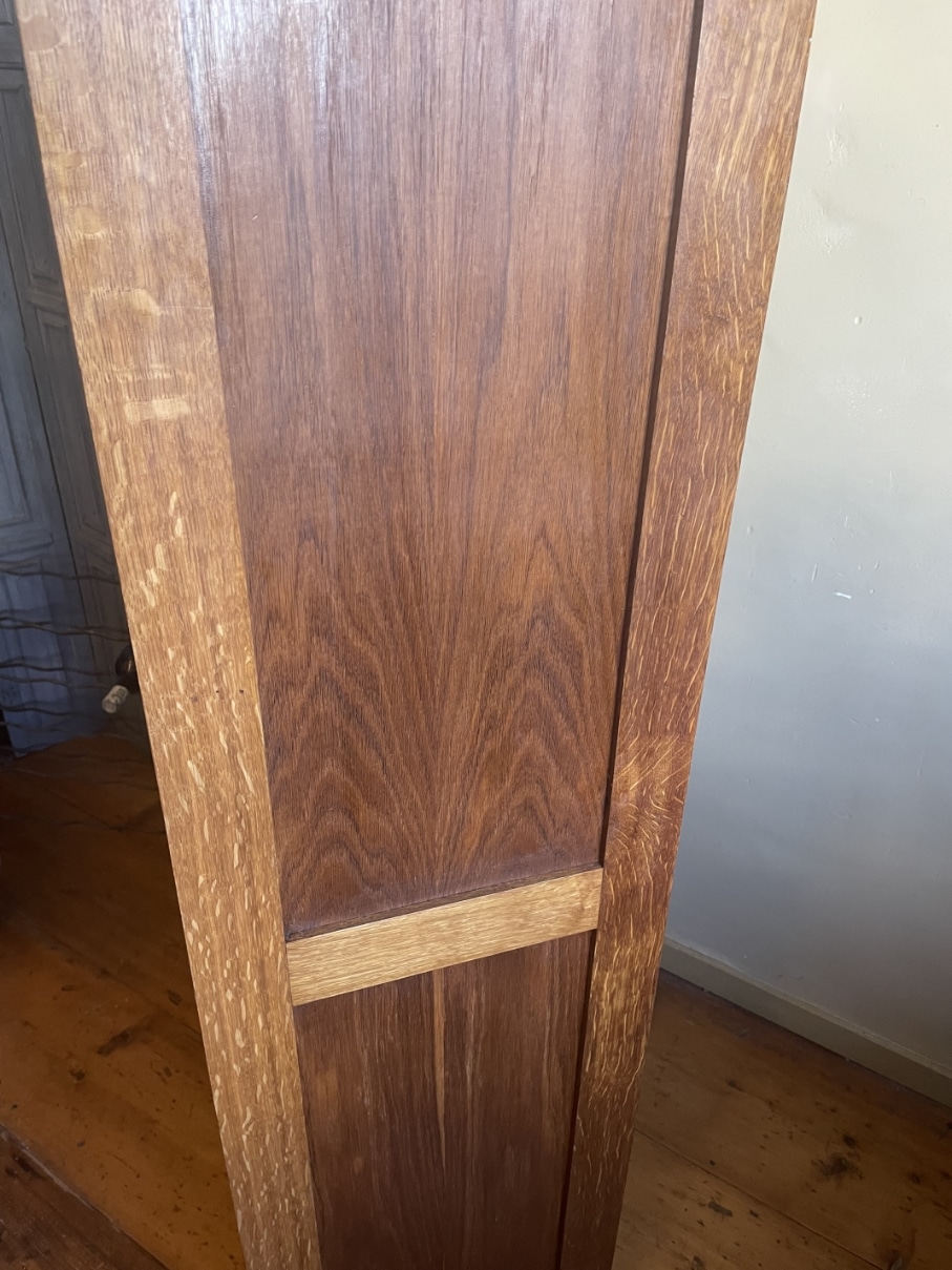 Gemaakt van eikenhout. Leuk detail zijn de strakke houten greepjes met daarboven het metalen beslag.