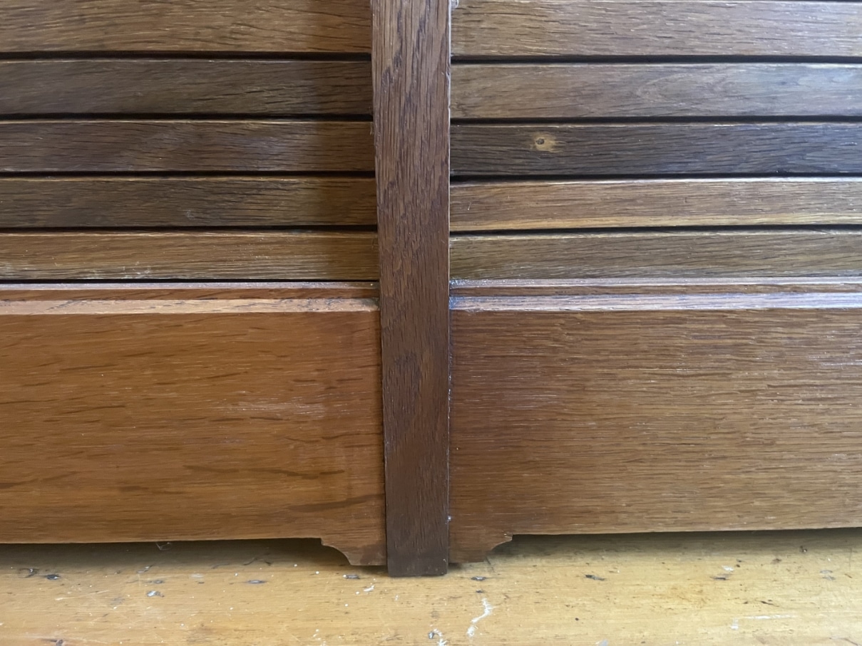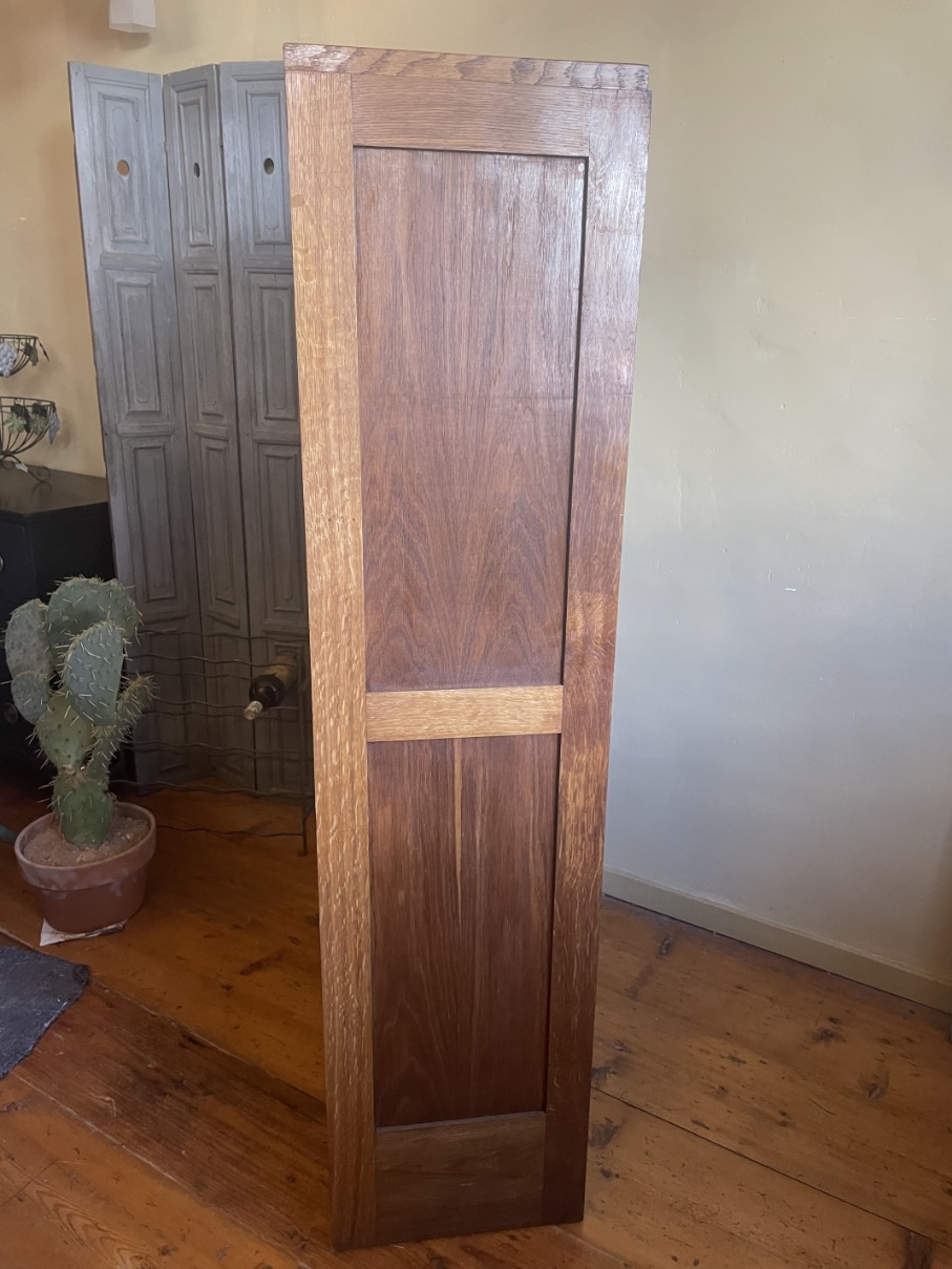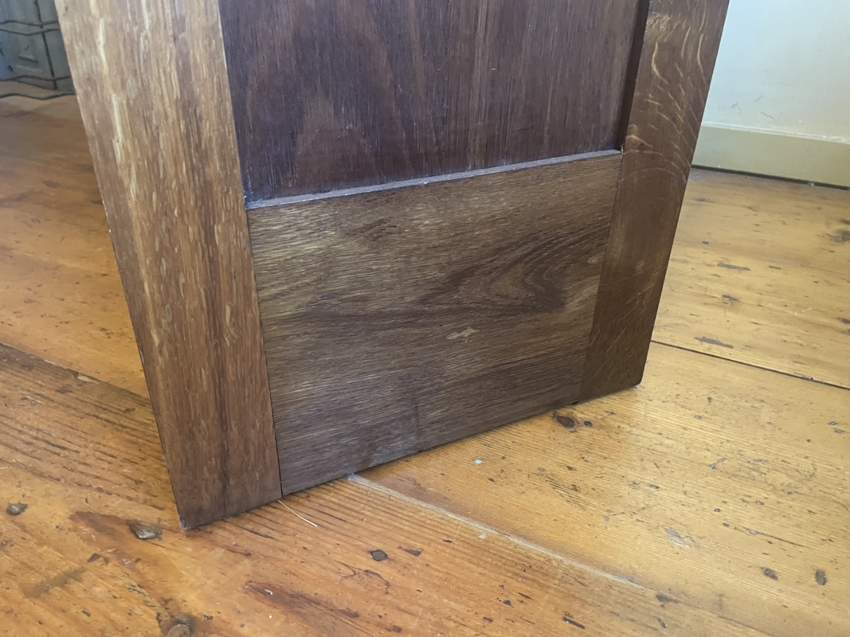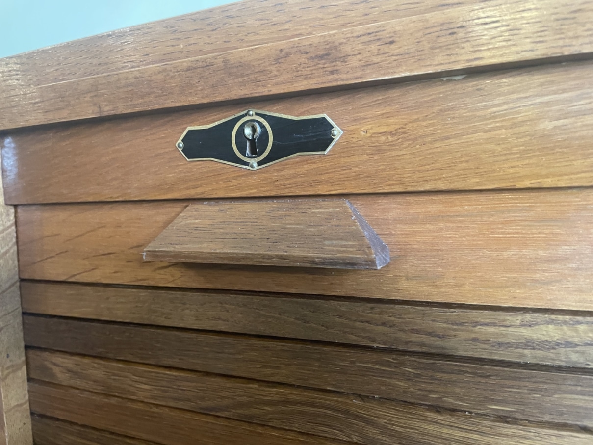 Gemaakt van eikenhout. Leuk detail zijn de strakke houten greepjes met daarboven het metalen beslag.