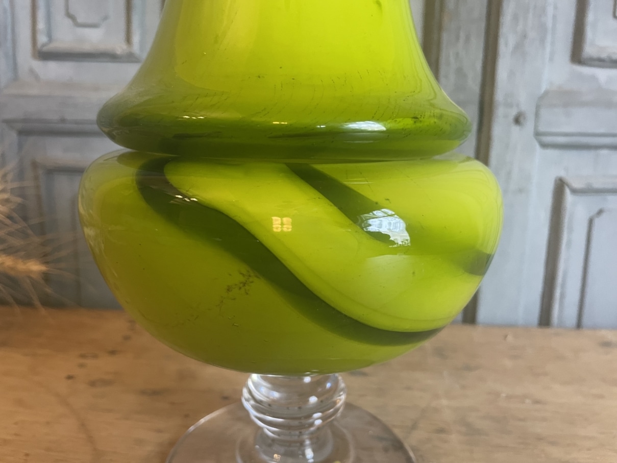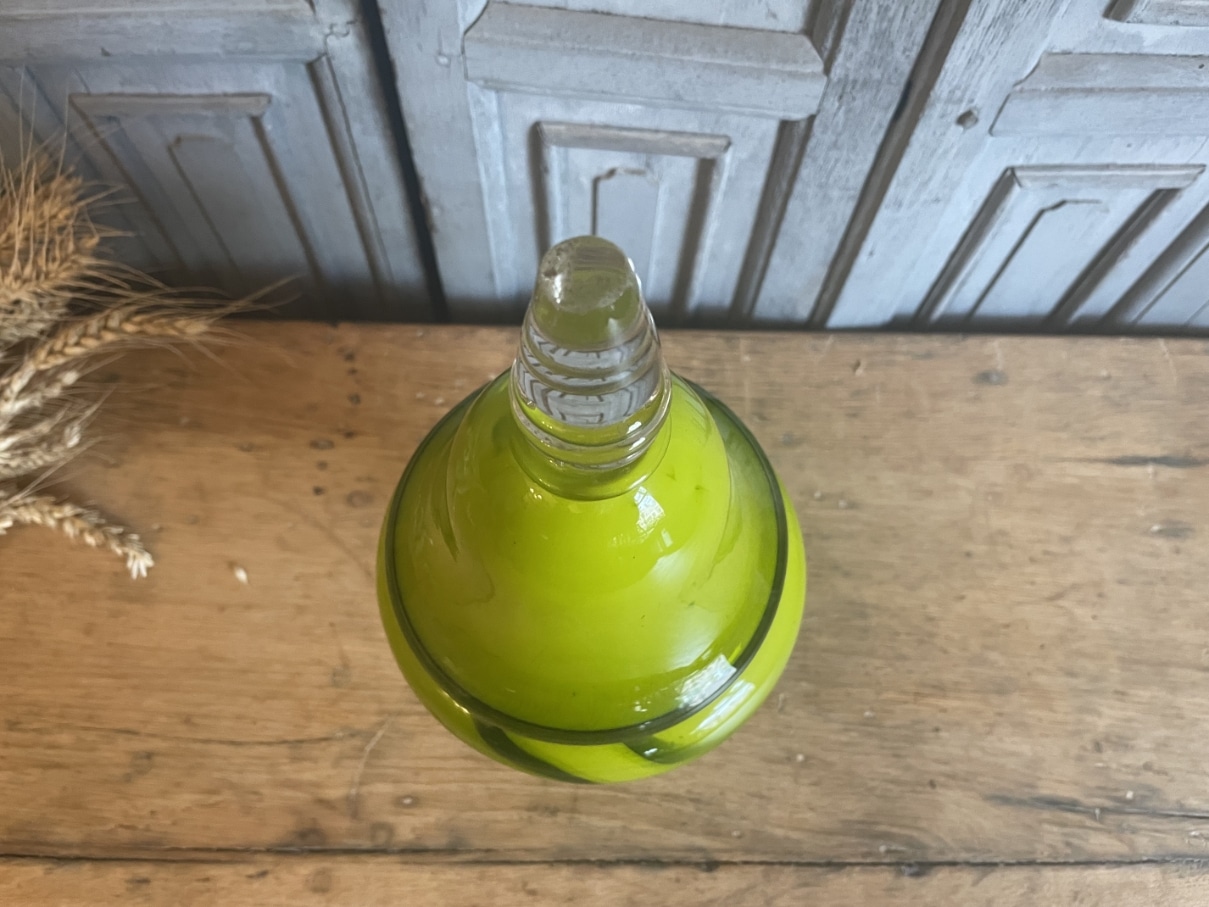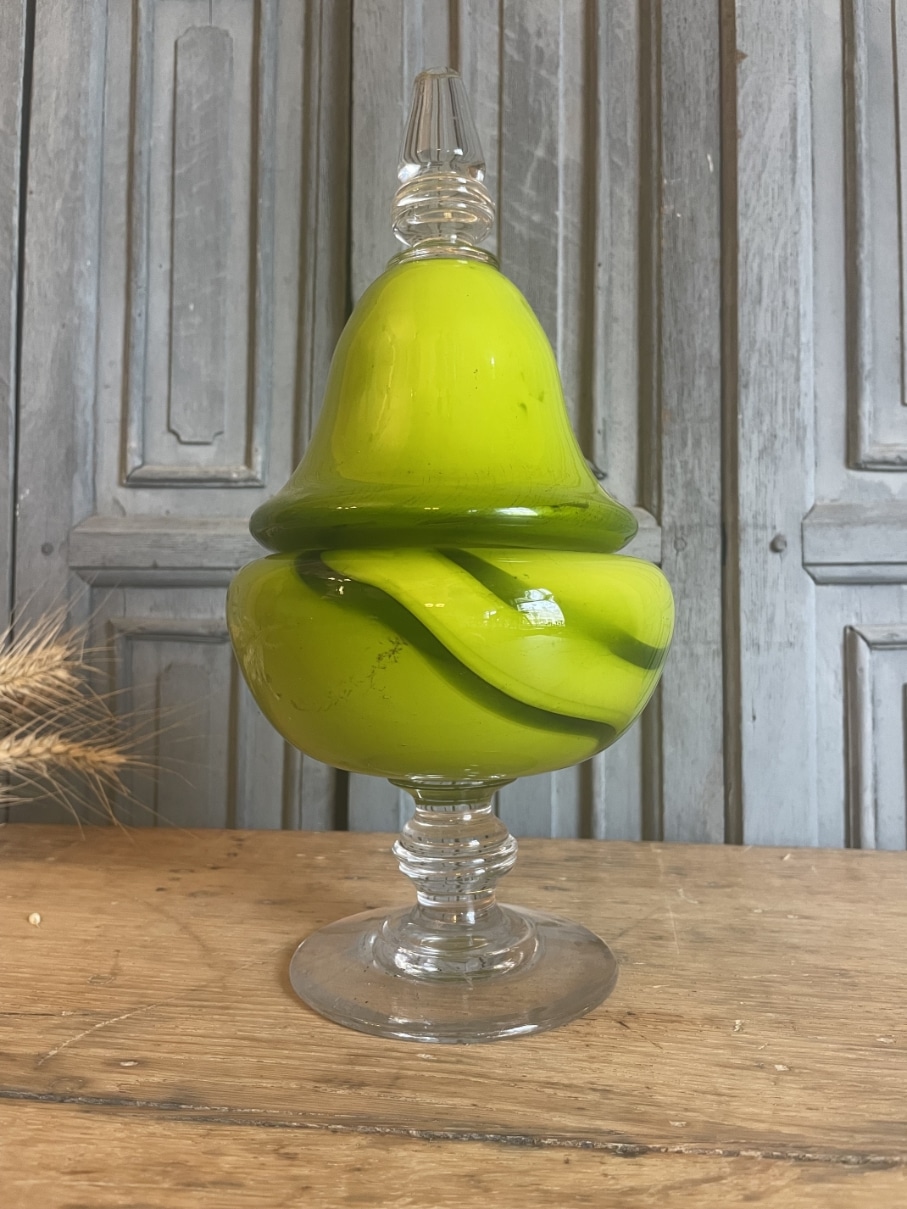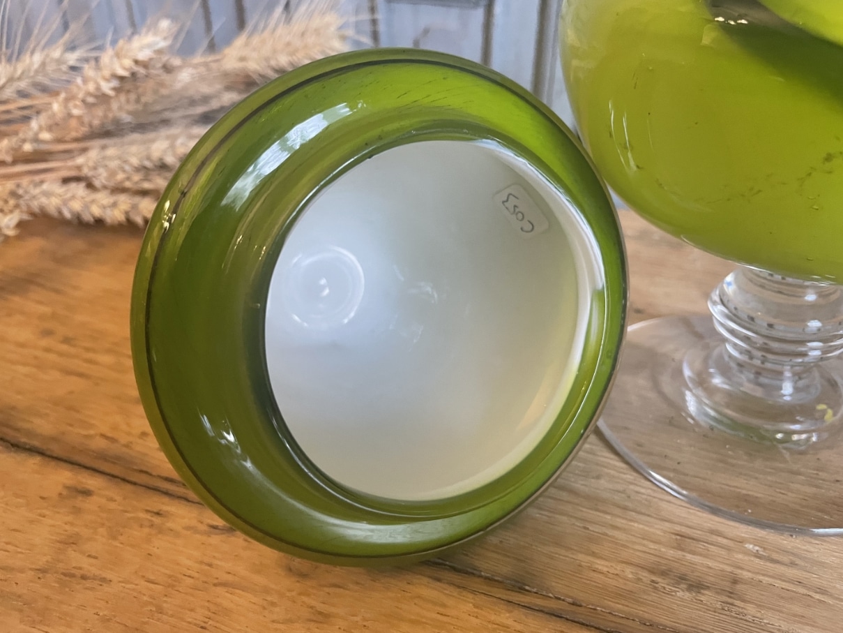 De kleur is helder groen met daarin donkergroen wat in het glas zit.