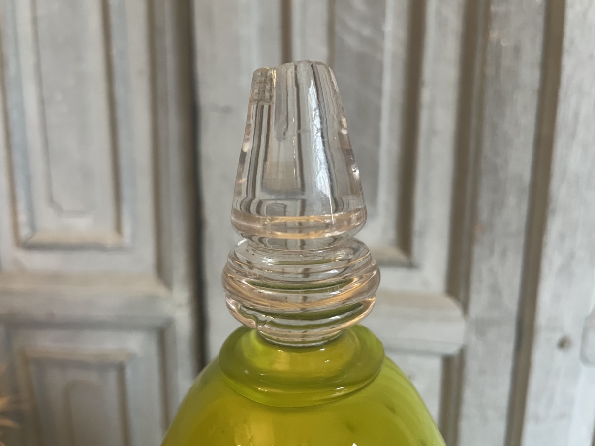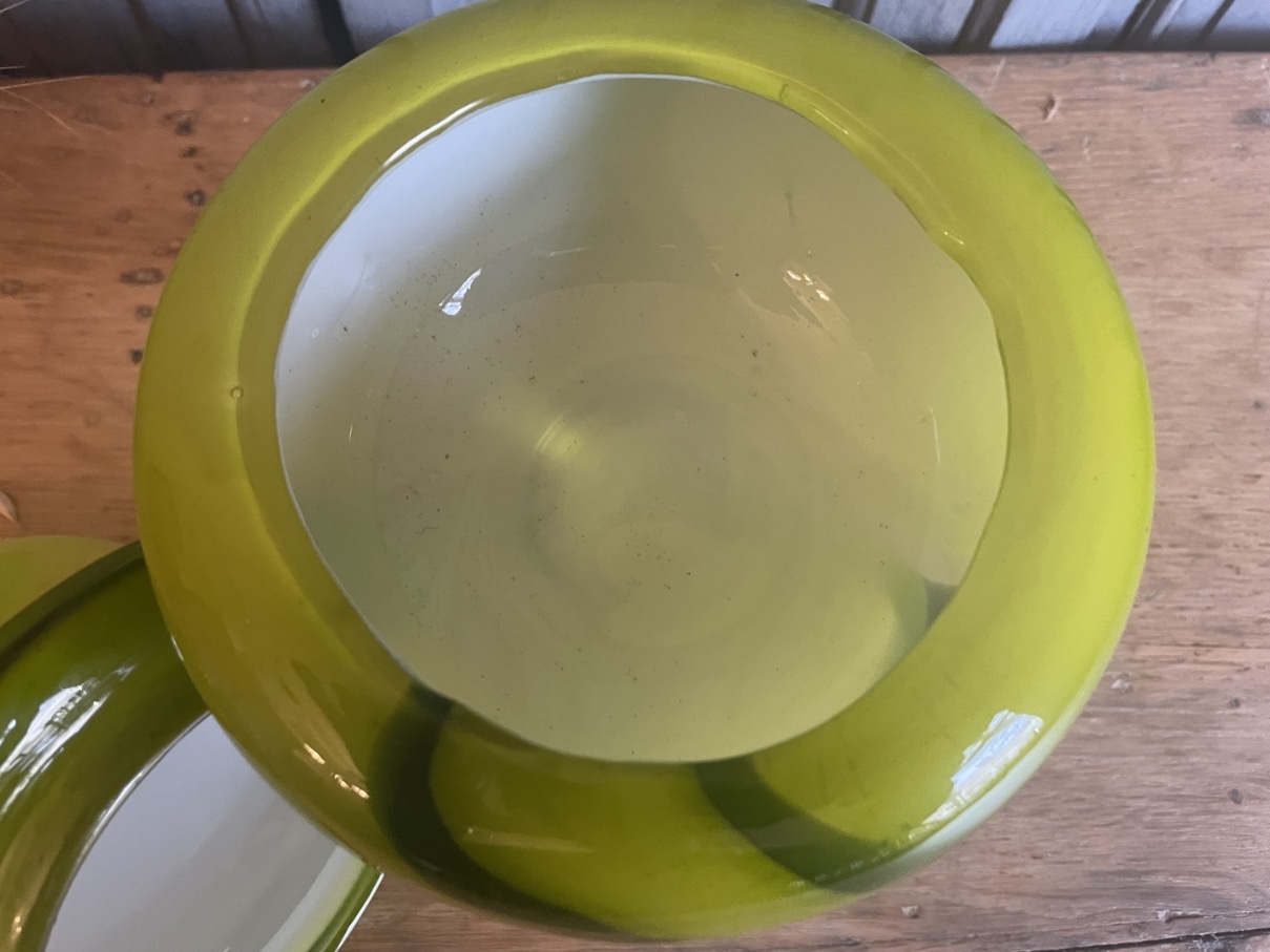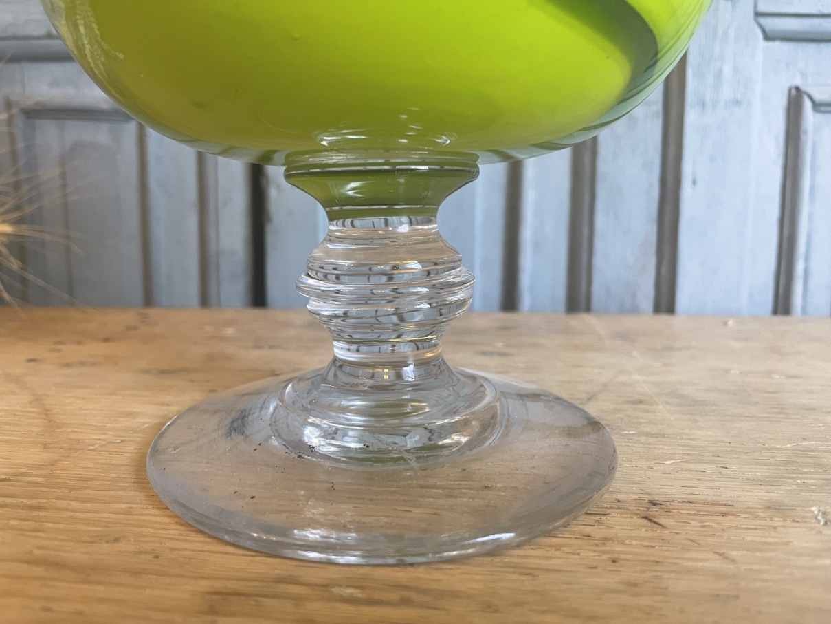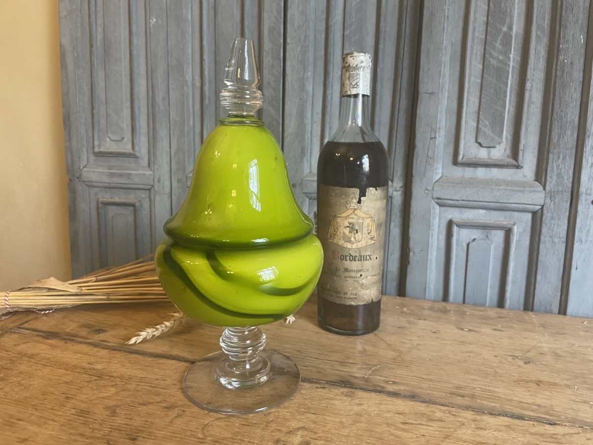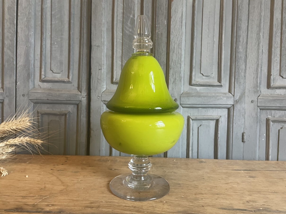 De kleur is helder groen met daarin donkergroen wat in het glas zit.