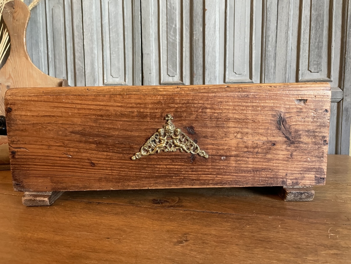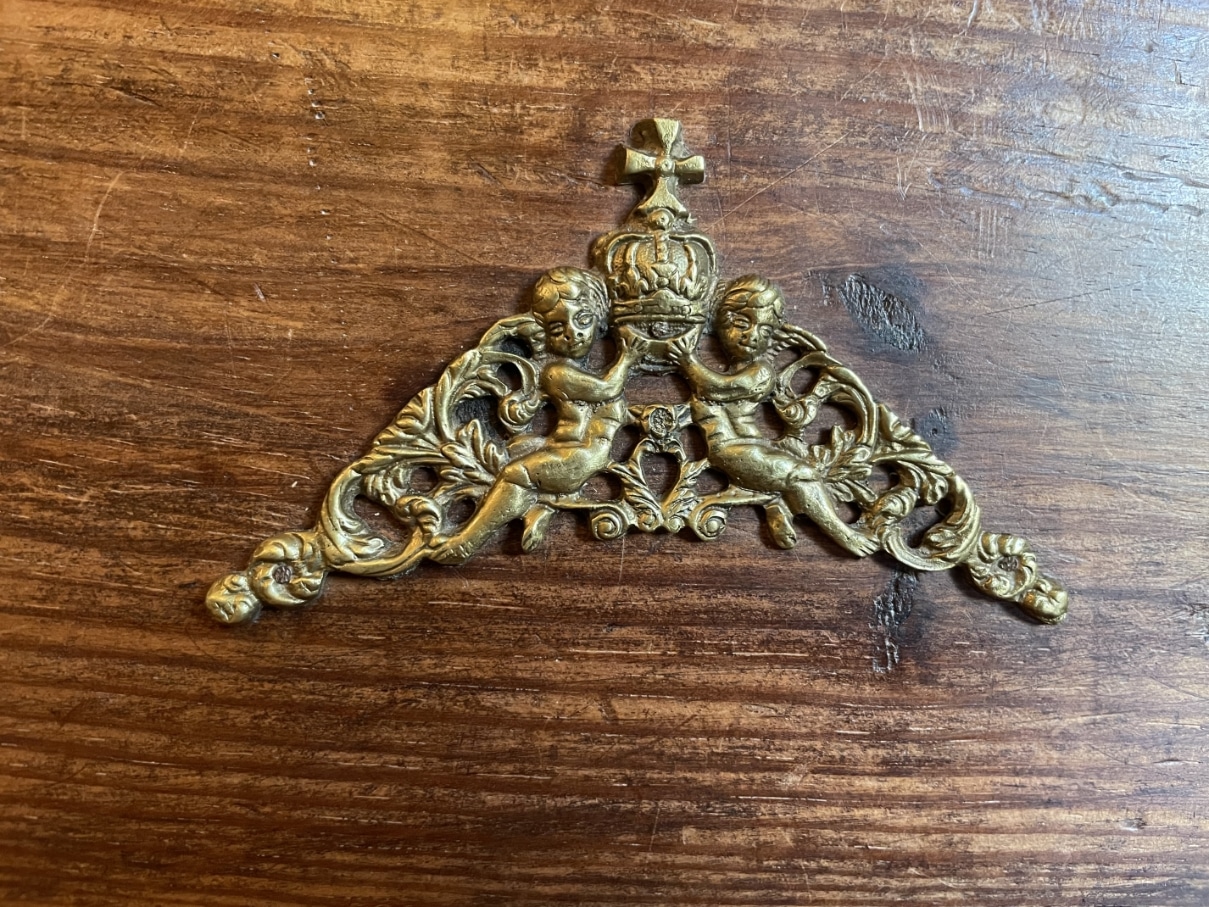 Op de achterkant of voorkant hoe je het ook bekijkt zit een messing versiering met engelen.