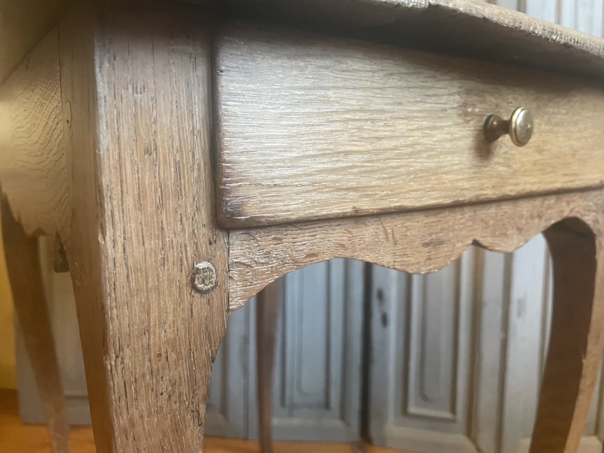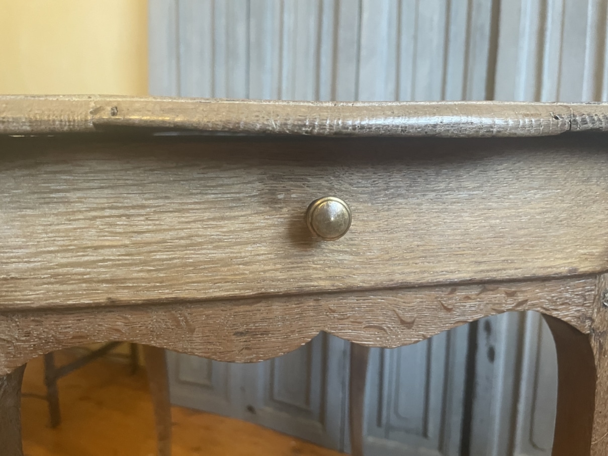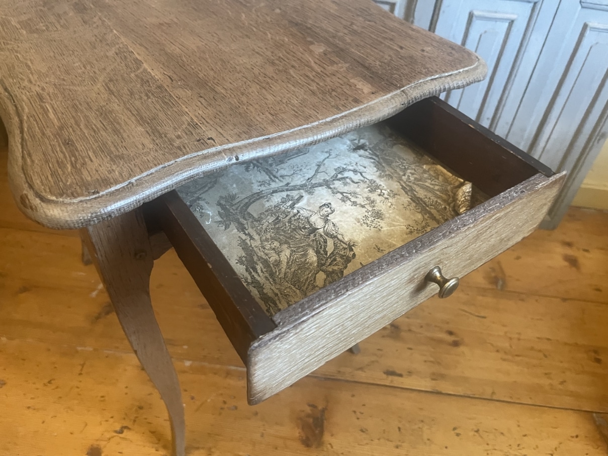 Aan een kopse kant zit een la met een messing knopje.