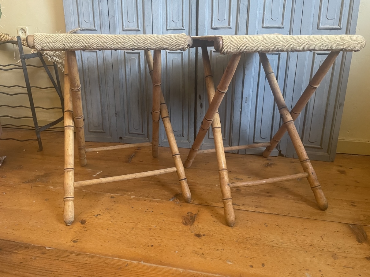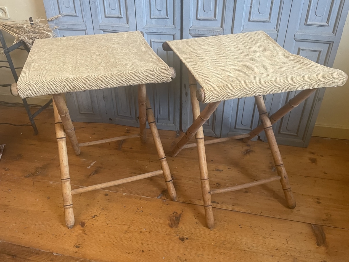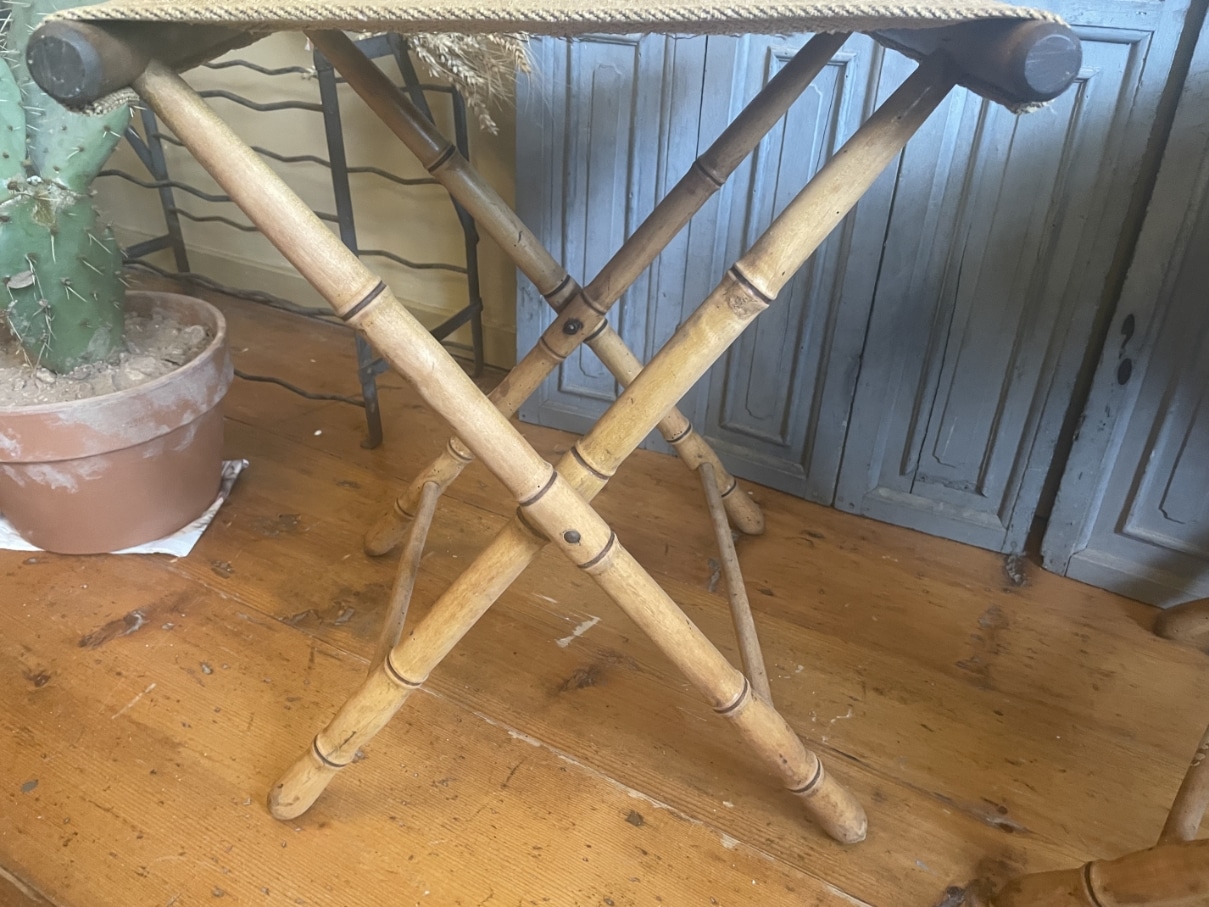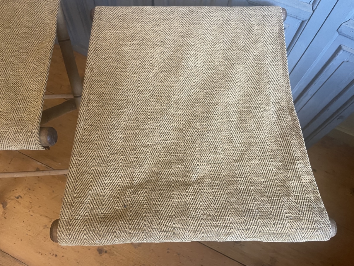 Mooie vouwkrukje gemaakt van faux Bamboe en meubelstof.