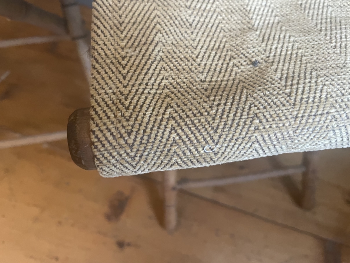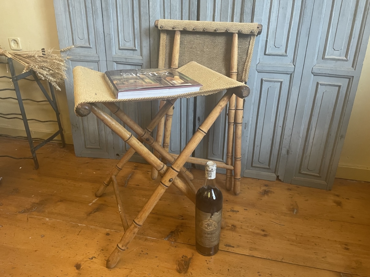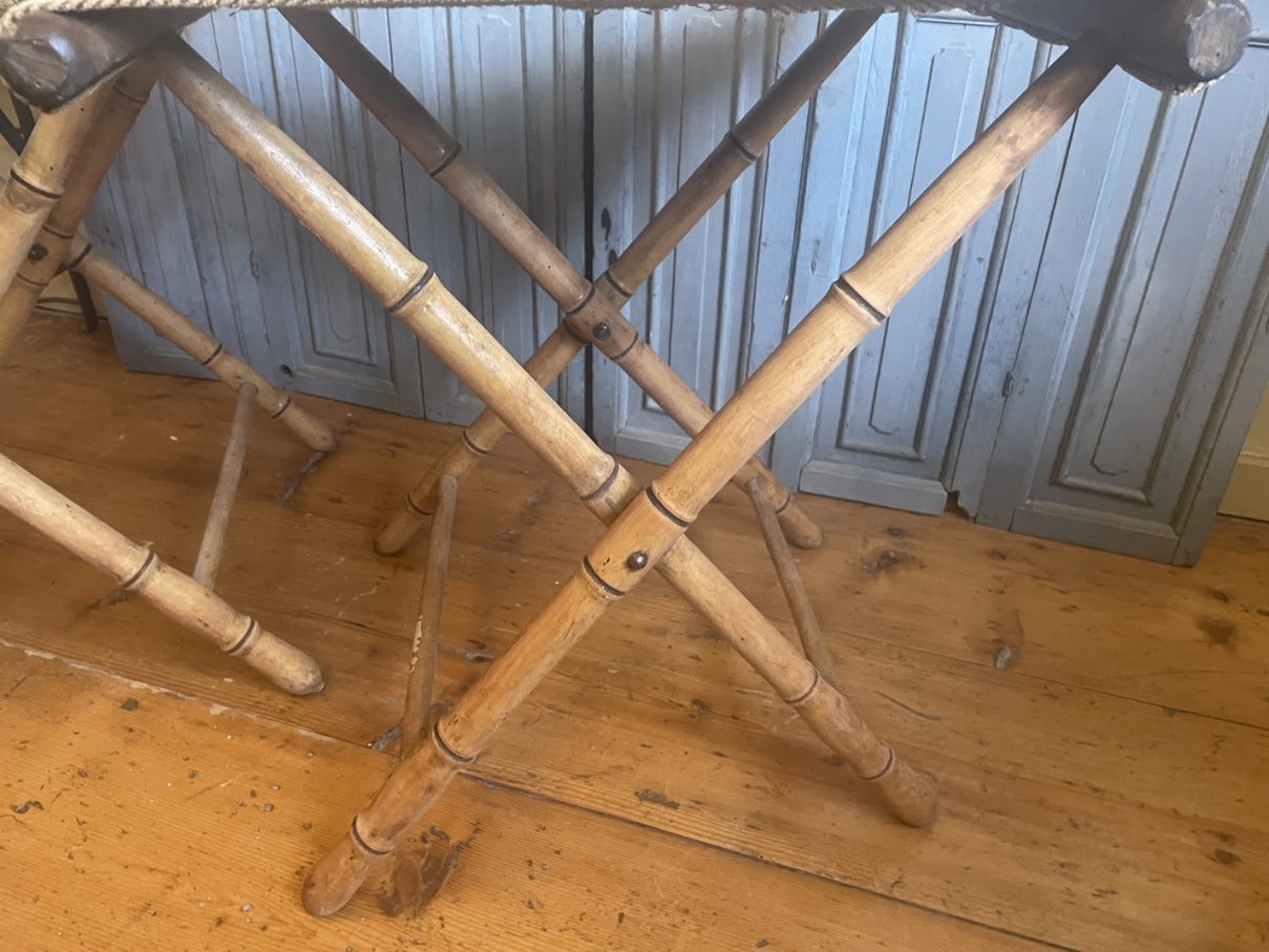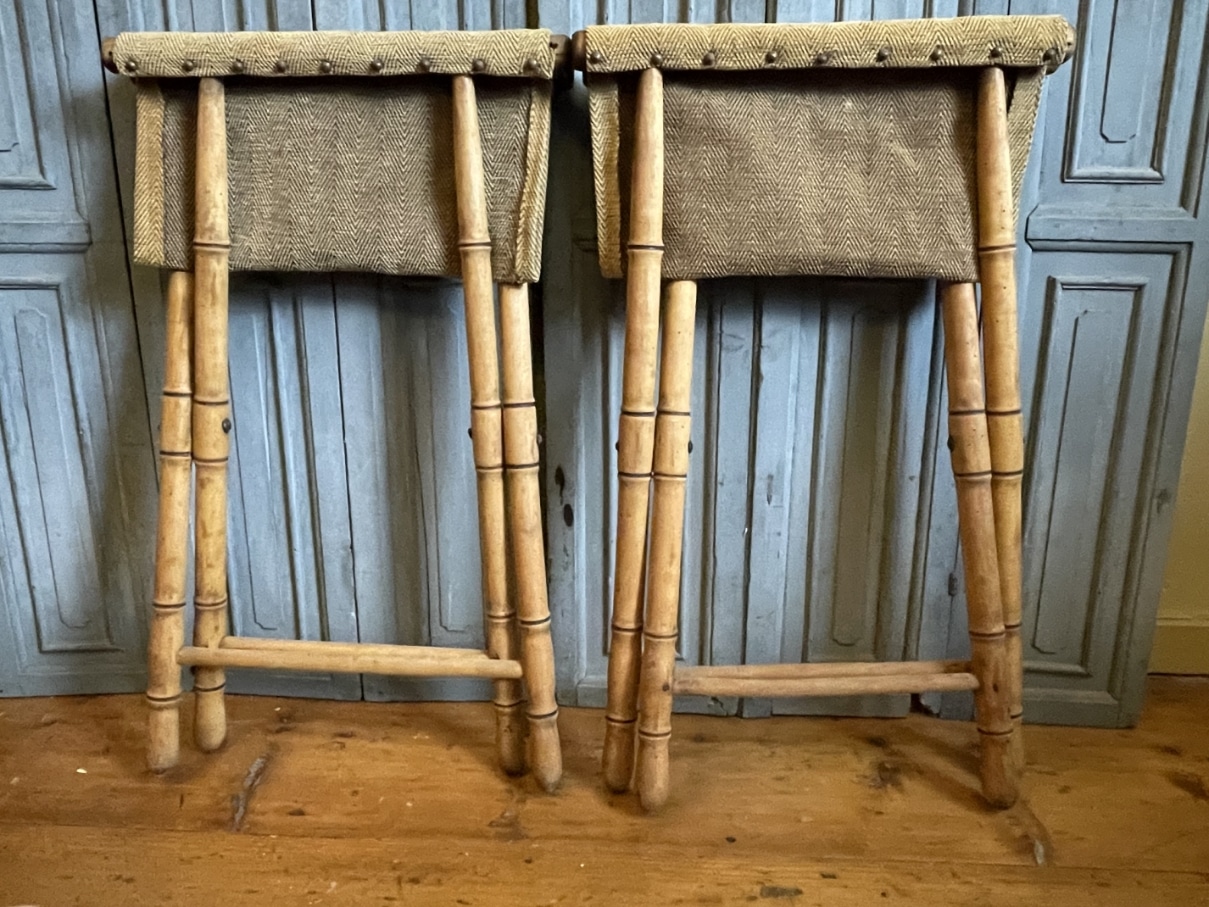 Mooie vouwkrukje gemaakt van faux Bamboe en meubelstof.